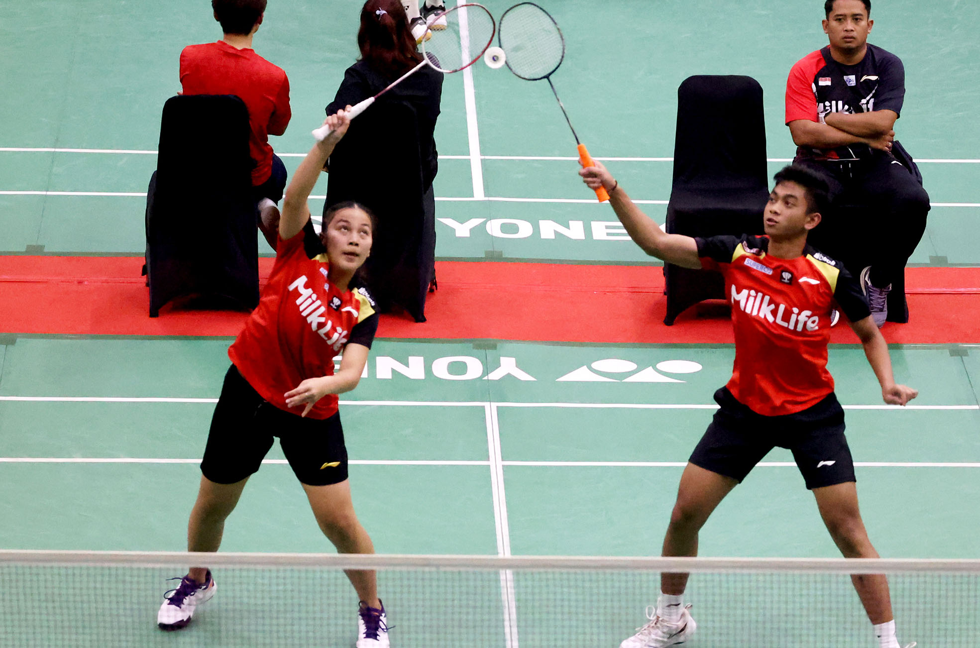 Raihan Daffa Edsel Pramono/Dian Ramadhani Mukti pada gelaran YONEX Sunrise Pembangunan Jaya Raya Junior International Grand Prix 2024 yang berlangsung di GOR PB Jaya Raya Bintaro, Rabu (10/7).