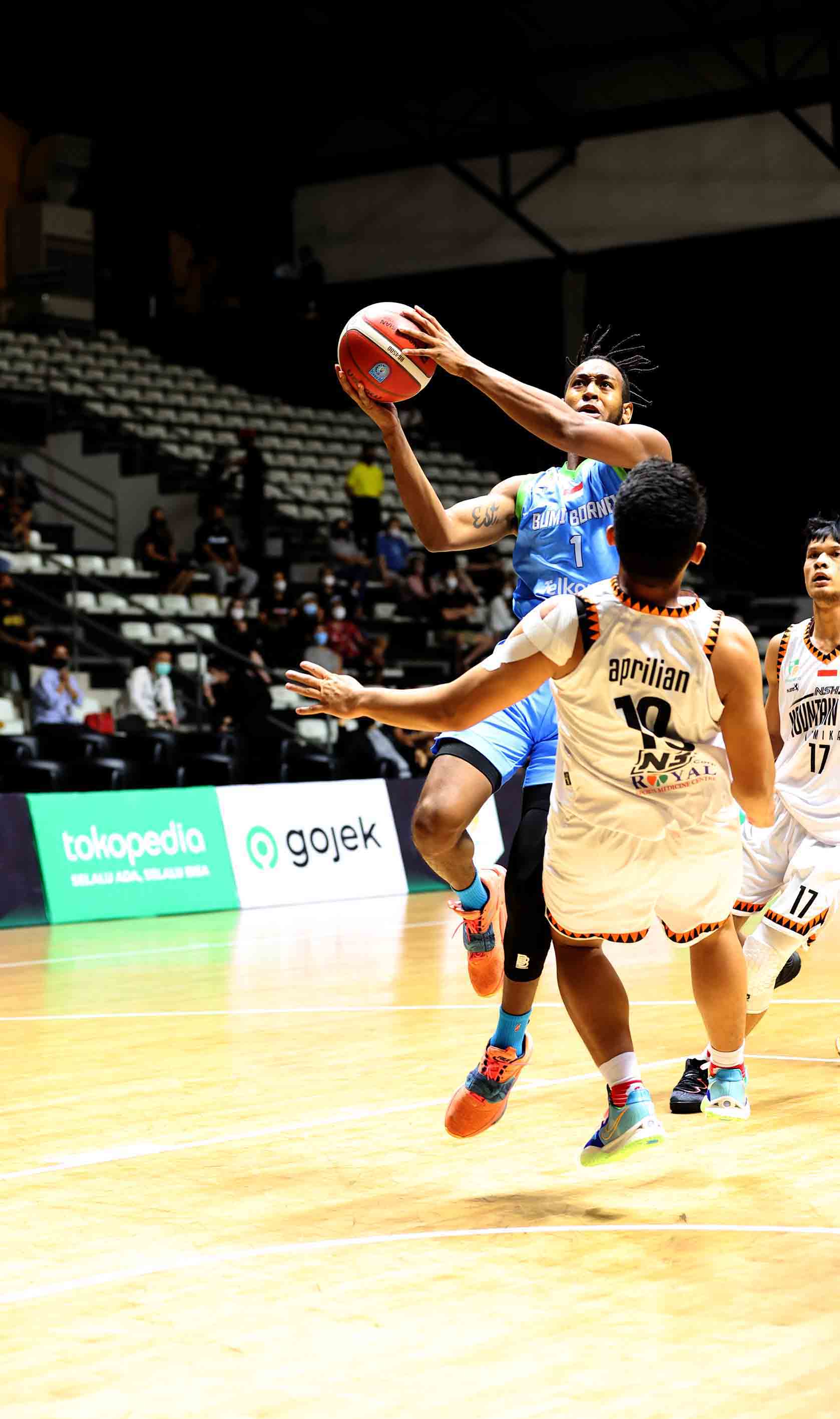 Randy Bell (1) pemain Bumi Borneo Basketball Pontianak melempar bola ke arah ring lawan. Bumi Borneo Basketball Pontianak melawan NSH Mountain Gold Timika pada pertandingan Seri 1 Jakarta Indonesian Basketball League (IBL) 2022 di Hall Basket GBK, Jakarta, Sabtu (15/1/2022). Bumi Borneo Basketball Pontianak kalah oleh NSH Mountain Gold Timika dengan skor 60-68. (Photo : Bobby Arifin)