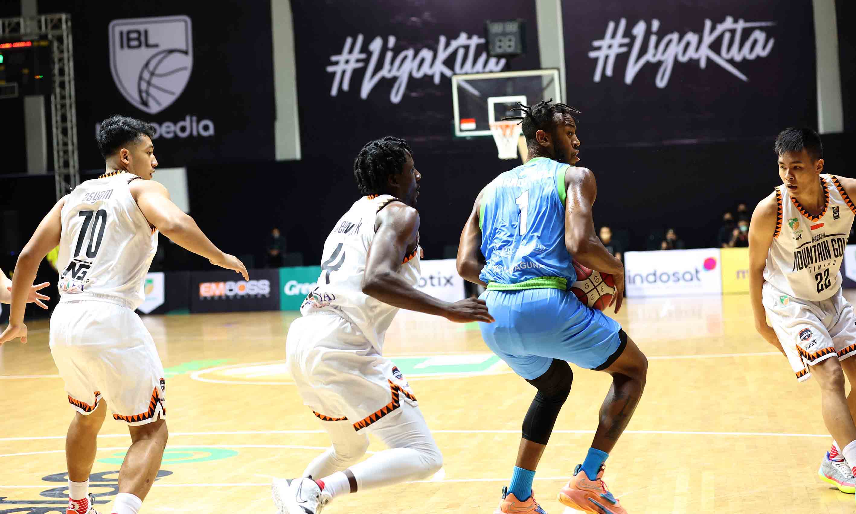 Randy Bell (1) pemain Bumi Borneo Basketball Pontianak mendapat hadangan dari pebasket NSH Mountain Gold Timika, Shavar Tahrel Newkirk (4). Bumi Borneo Basketball Pontianak melawan NSH Mountain Gold Timika pada pertandingan Seri 1 Jakarta Indonesian Basketball League (IBL) 2022 di Hall Basket GBK, Jakarta, Sabtu (15/1/2022). Bumi Borneo Basketball Pontianak kalah oleh NSH Mountain Gold Timika dengan skor 60-68. (Photo : Bobby Arifin)
