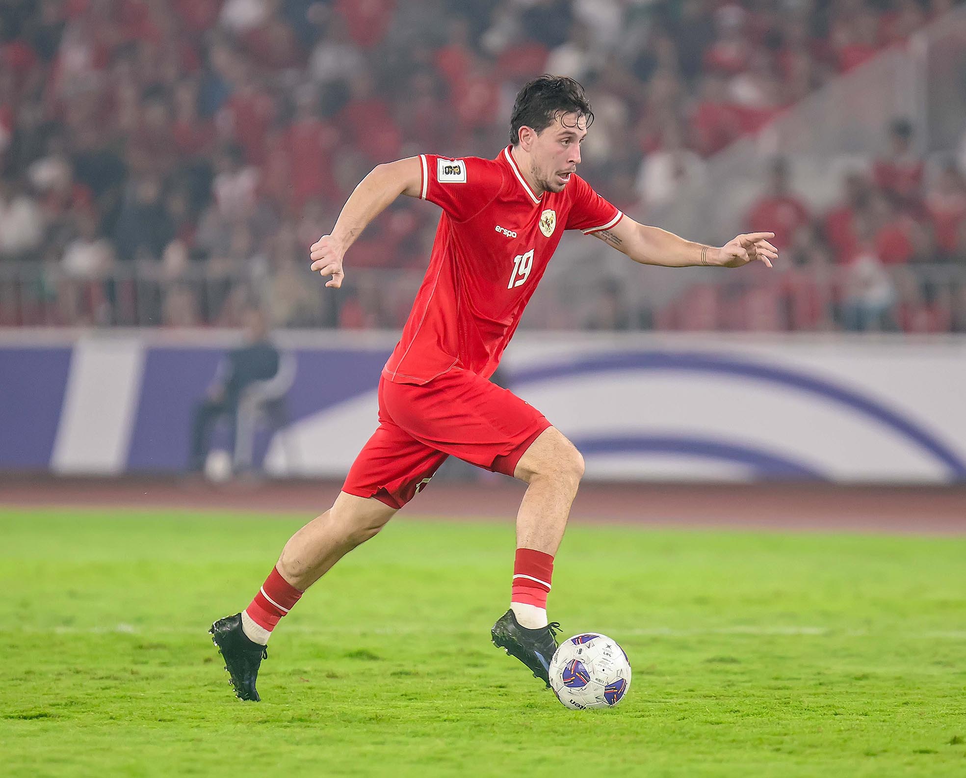 Pesepak bola Timnas Indonesia, Thom Jan Haye (19) menggiring bola saat menghadapi Timnas Jepang, pada lanjutan laga Grup C Babak Ketiga Kualifikasi Piala Dunia 2026 di Stadion Utama Gelora Bung Karno (SUGBK), Senayan, Jakarta, Jumat (15/11/2024). Timnas Indonesia kalah dari Jepang dengan skor akhir 0-4. Sportsmoment.id/Ady Sesotya