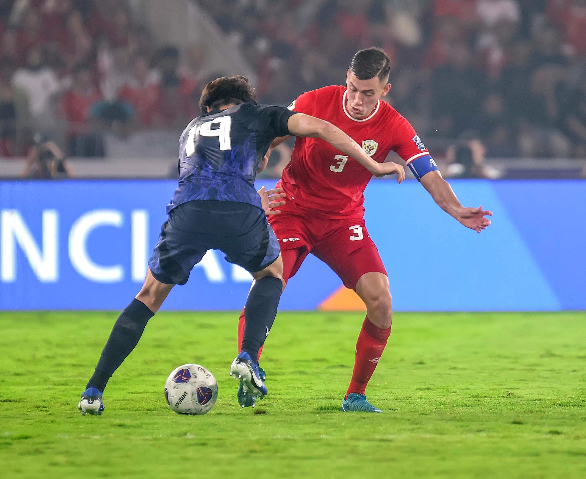 Pesepak bola Timnas Indonesia, Jay Idzes (3) coba menghadang pemain Timnas Jepang, Koki Ogawa(19) pada lanjutan laga Grup C Babak Ketiga Kualifikasi Piala Dunia 2026 di Stadion Utama Gelora Bung Karno (SUGBK), Senayan, Jakarta, Jumat (15/11/2024). Timnas Indonesia kalah dari Jepang dengan skor akhir 0-4. Sportsmoment.id/Ady Sesotya