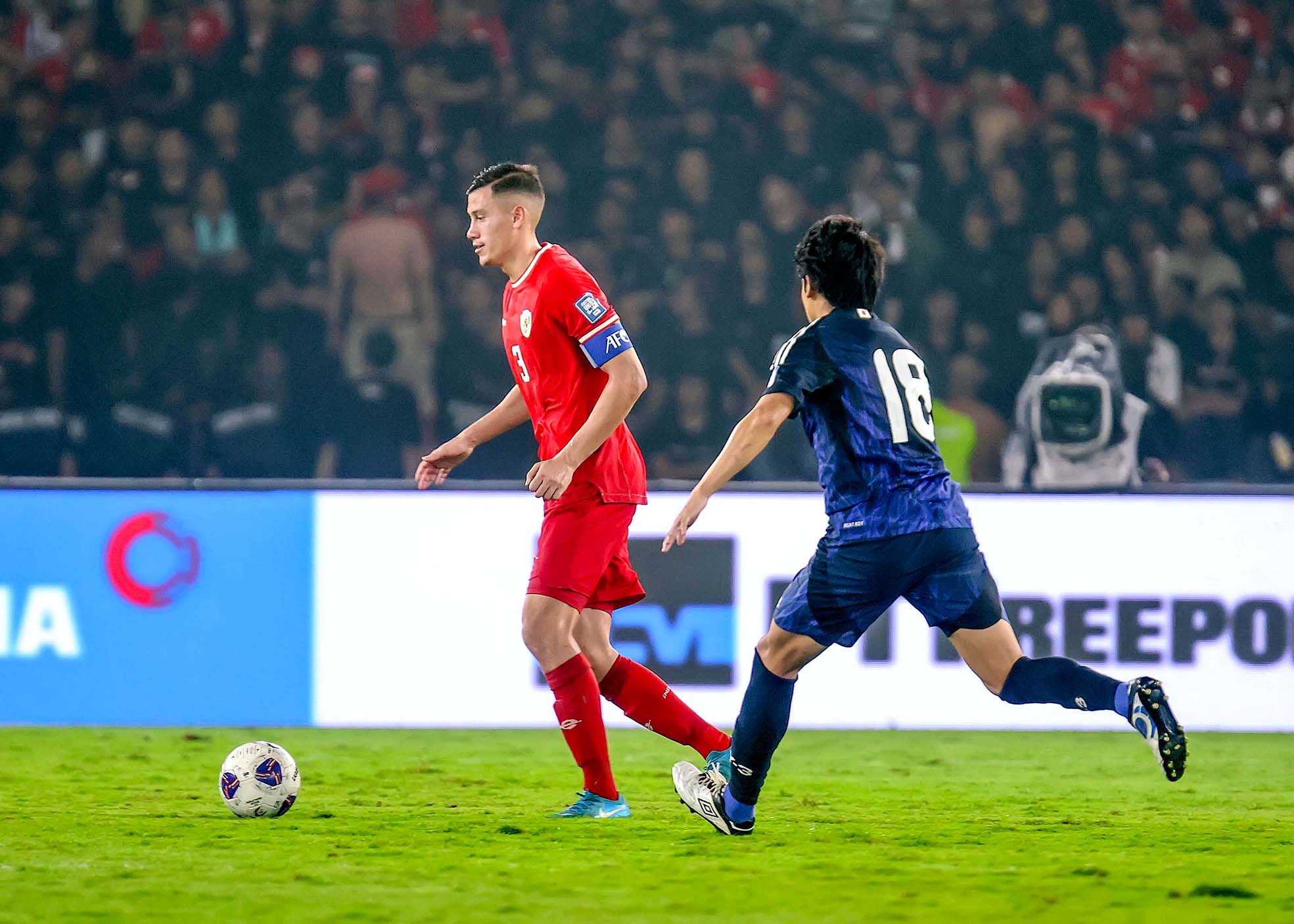 Pesepak bola Timnas Indonesia, Jay Noah Idzes (3) mencoba mengamankan bola dari kejaran pemain Timnas Jepang, Ohashi Yuki (18) pada lanjutan laga Grup C Babak Ketiga Kualifikasi Piala Dunia 2026 di Stadion Utama Gelora Bung Karno (SUGBK), Senayan, Jakarta, Jumat (15/11/2024). Timnas Indonesia kalah dari Jepang dengan skor akhir 0-4. Sportsmoment.id/Ady Sesotya