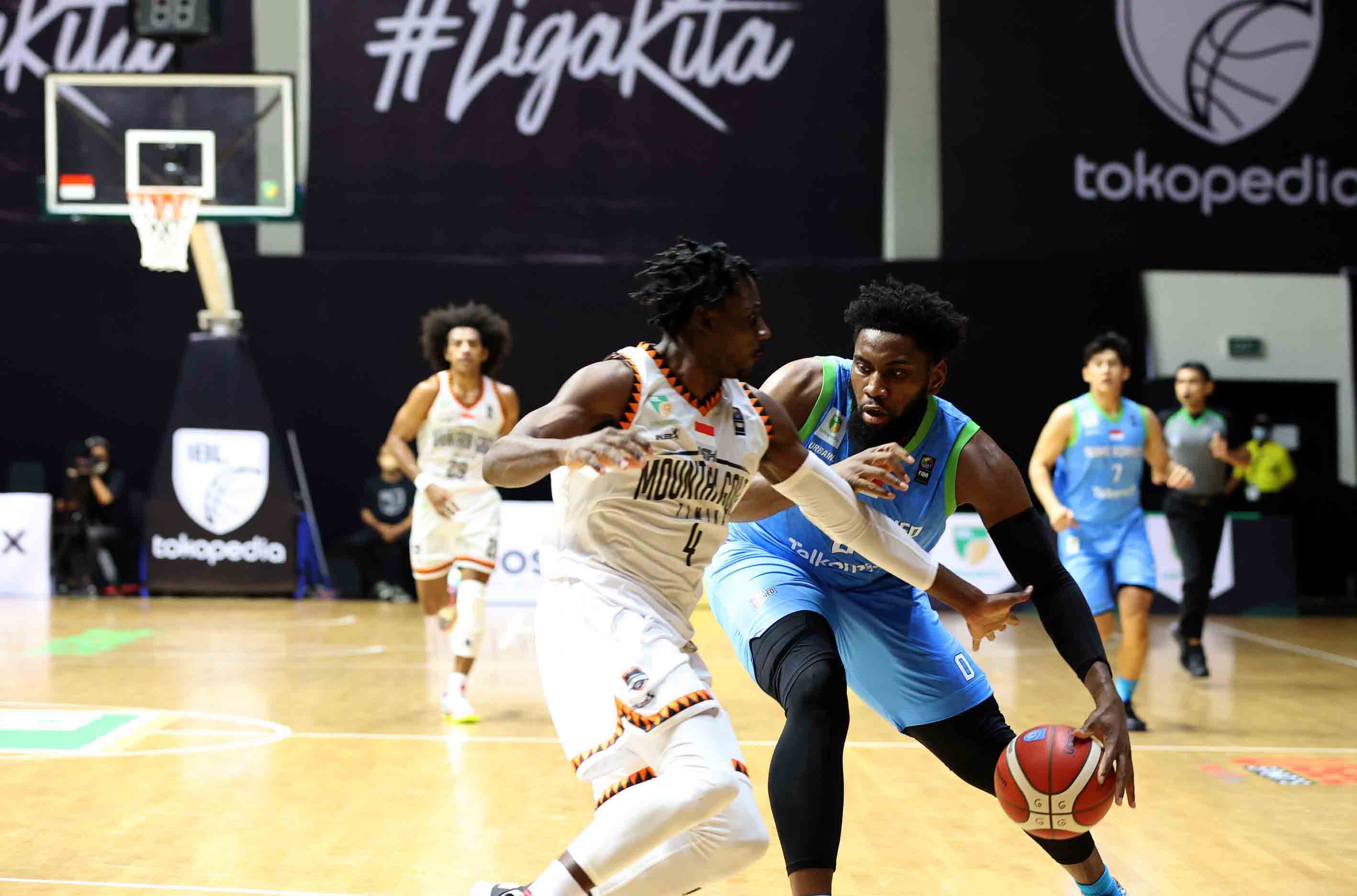 Austin Mofunanya (0) pemain Bumi Borneo Basketball Pontianak mendapat kawalan dari pebasket NSH Mountain Gold Timika, Shavar Tahrel Newkirk (4). Bumi Borneo Basketball Pontianak melawan NSH Mountain Gold Timika pada pertandingan Seri 1 Jakarta Indonesian Basketball League (IBL) 2022 di Hall Basket GBK, Jakarta, Sabtu (15/1/2022). Bumi Borneo Basketball Pontianak kalah oleh NSH Mountain Gold Timika dengan skor 60-68. (Photo : Bobby Arifin)