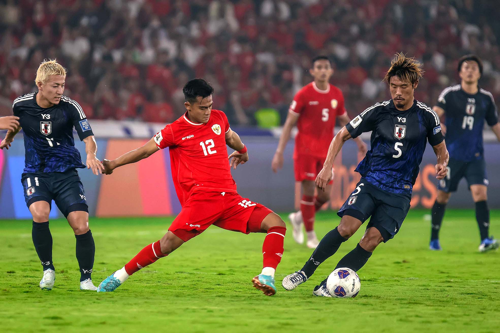 Pesepak bola Timnas Indonesia, Pratama Arhan (12) berebut bola pemain Timnas Jepang, Hidemasa Morita dalam laga Grup C Babak Ketiga Kualifikasi Piala Dunia 2026 di Stadion Utama Gelora Bung Karno (SUGBK), Senayan, Jakarta, Jumat (15/11/2024). Timnas Indonesia kalah dari Jepang dengan skor akhir 0-4. Sportsmoment.id/Ady Sesotya