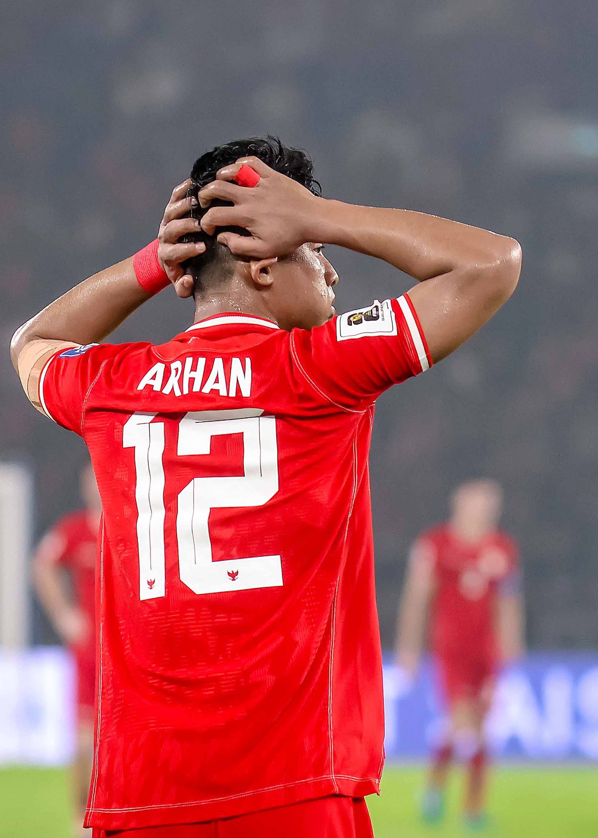 Pesepak bola Timnas Indonesia, Pratama Arhan (12) menunjukkan gesture kecewa usai gagal mencetak gol saat laga melawan Timnas Jepang, pada lanjutan laga Grup C Babak Ketiga Kualifikasi Piala Dunia 2026 di Stadion Utama Gelora Bung Karno (SUGBK), Senayan, Jakarta, Jumat (15/11/2024). Timnas Indonesia kalah dari Jepang dengan skor akhir 0-4. Sportsmoment.id/Ady Sesotya