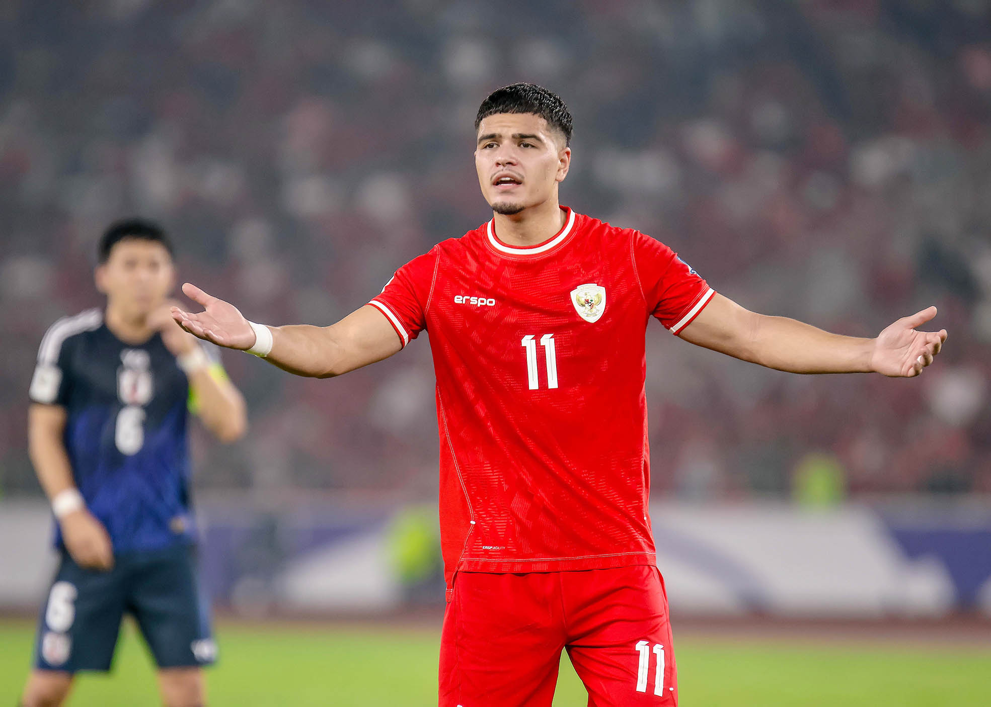 Pesepak bola Timnas Indonesia, Ragnar Oratmangoen (11) saat melawan Timnas Jepang, pada lanjutan laga Grup C Babak Ketiga Kualifikasi Piala Dunia 2026 di Stadion Utama Gelora Bung Karno (SUGBK), Senayan, Jakarta, Jumat (15/11/2024). Timnas Indonesia kalah dari Jepang dengan skor akhir 0-4. Sportsmoment.id/Ady Sesotya