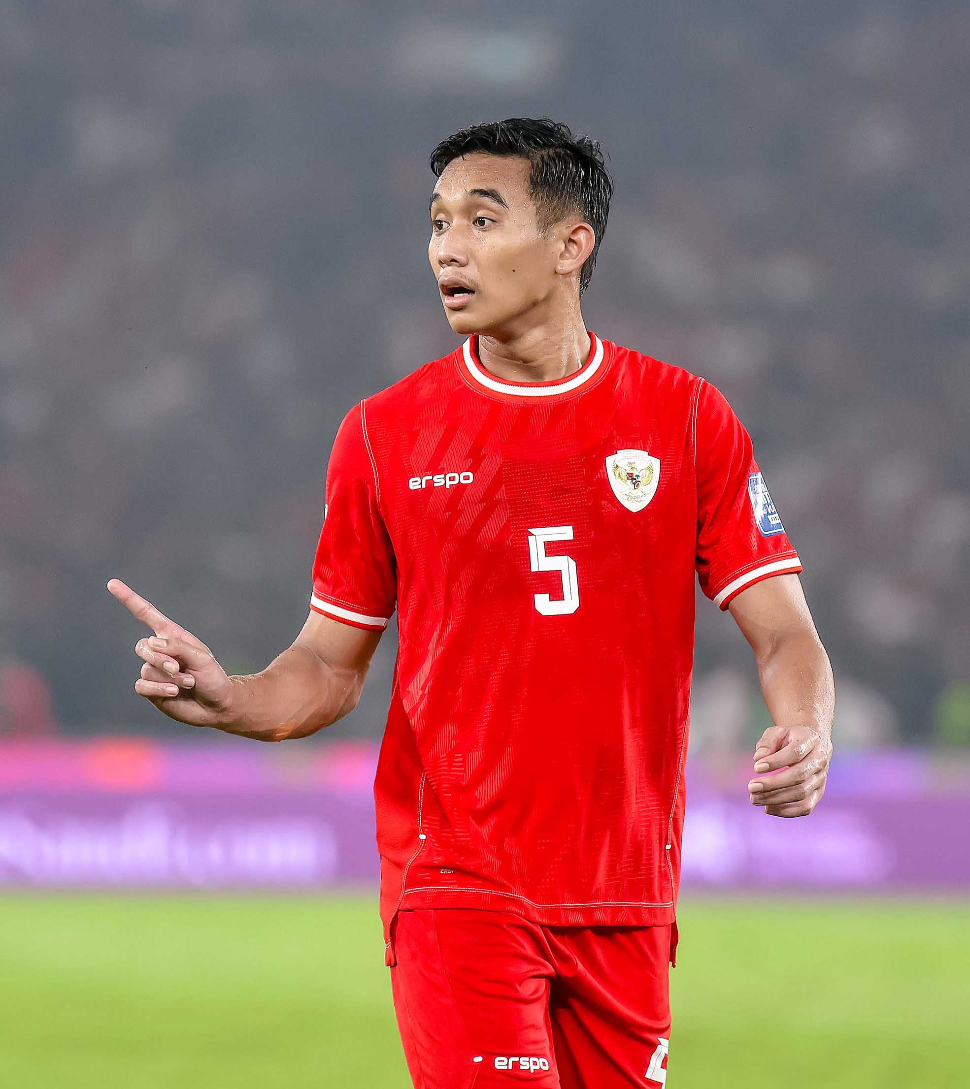 Pesepak bola Timnas Indonesia Rizky Ridho Ramadhani (5) memberikan kode saat laga melawan Timnas Jepang dalam laga Grup C Babak Ketiga Kualifikasi Piala Dunia 2026 di Stadion Utama Gelora Bung Karno (SUGBK), Senayan, Jakarta, Jumat (15/11/2024). Timnas Indonesia kalah dari Jepang dengan skor akhir 0-4. Sportsmoment.id/Ady Sesotya