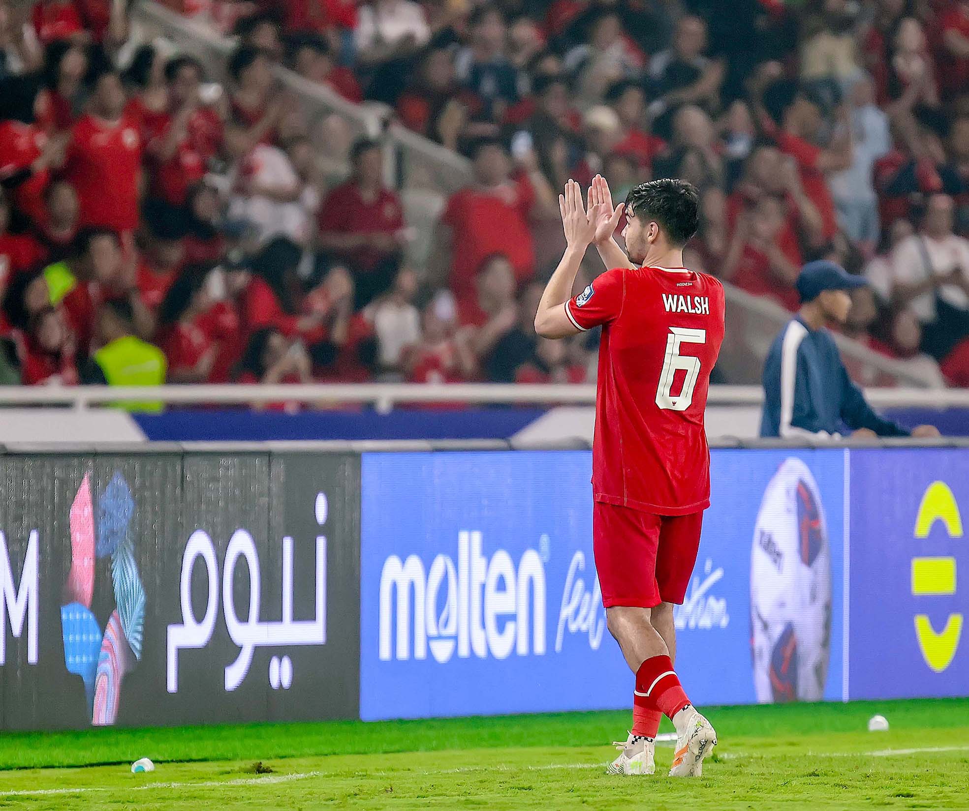 Pesepak bola Timnas Indonesia, Sandy Walsh (6) menyapa suporter usai laga melawan Timnas Jepang, Daizen Maeda (11) pada lanjutan laga Grup C Babak Ketiga Kualifikasi Piala Dunia 2026 di Stadion Utama Gelora Bung Karno (SUGBK), Senayan, Jakarta, Jumat (15/11/2024). Timnas Indonesia kalah dari Jepang dengan skor akhir 0-4. Sportsmoment.id/Ady Sesotya
