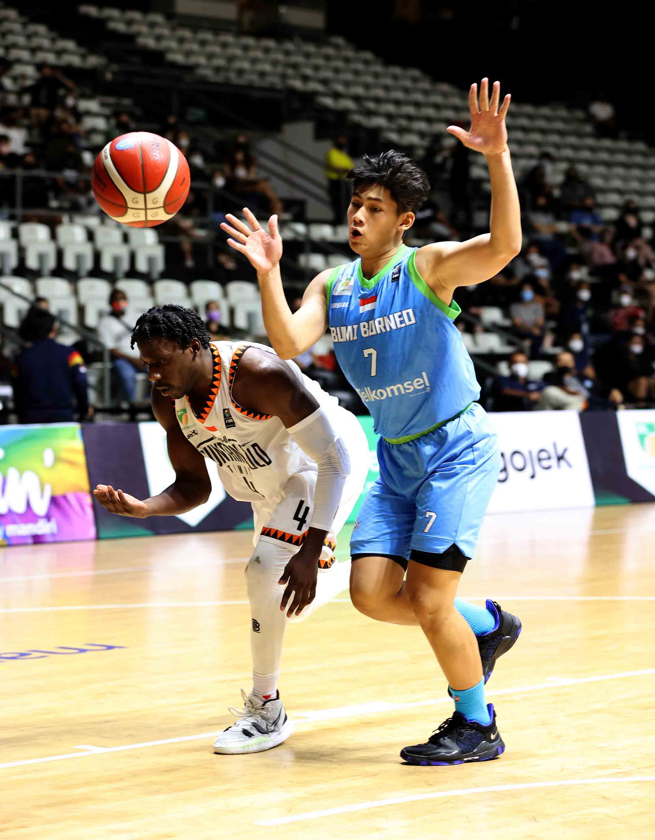 Shavar Tahrel Newkirk (4) pemain NSH Mountain Gold Timika mendapat hadangan dari pemain Bumi Borneo Basketball Pontianak, Steven Orlando (7). NSH Mountain Gold Timika melawan Bumi Borneo Basketball Pontianak pada pertandingan Seri 1 Jakarta Indonesian Basketball League (IBL) 2022 di Hall Basket GBK, Jakarta, Sabtu (15/1/2022). NSH Mountain Gold Timika menang atas Bumi Borneo Basketball Pontianak dengan skor 68-60. (Photo : Bobby Arifin)