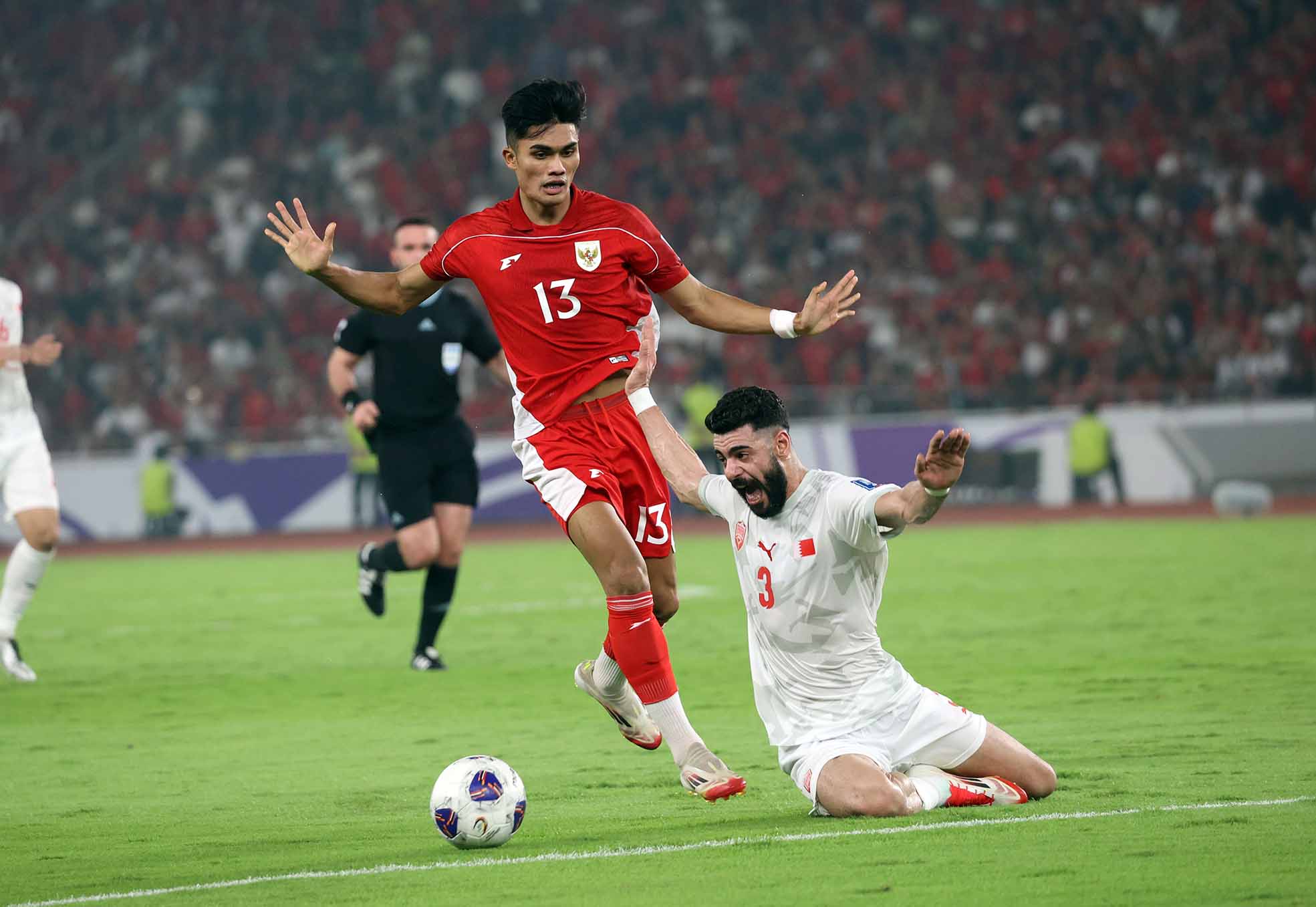 Pemain Indonesia Kevin Diks (2) beradu bola atas dengan pemain Bahrain saat pertandingan melawan Bahrain di pertandingan putaran ketiga Kualifikasi Piala Dunia 2026 di Stadion Utama Gelora Bung Karno, Senayan, Jakarta, Selasa, 25 Maret 2025.
