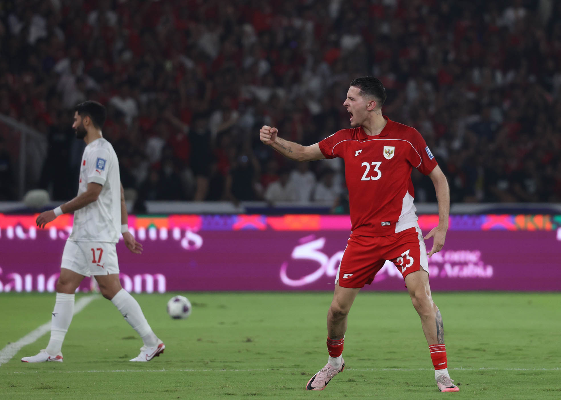 Pemain Indonesia, Justin Hubner (23) meluapkan emosinya saat pertandingan putaran ketiga Kualifikasi Piala Dunia 2026 di Stadion Utama Gelora Bung Karno, Senayan, Jakarta, Selasa, 25 Maret 2025.