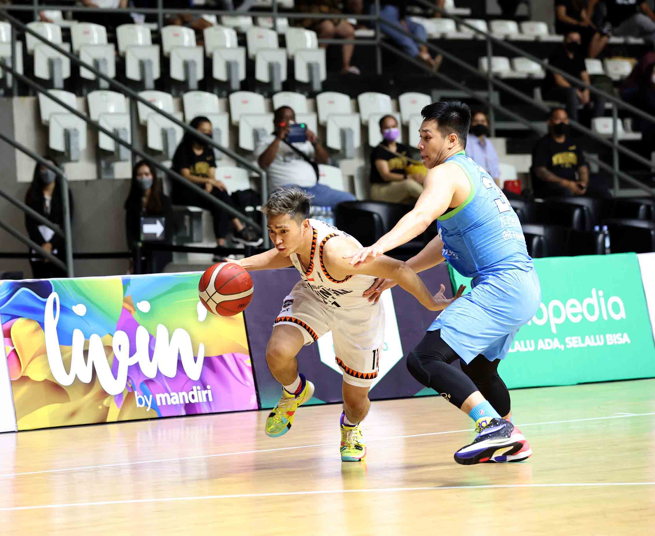 Rizky Agung Pranata (putih) pemain NSH Mountain Gold Timika mendapat kawalan dari pemain Bumi Borneo Basketball Pontianak. NSH Mountain Gold Timika melawan Bumi Borneo Basketball Pontianak pada pertandingan Seri 1 Jakarta Indonesian Basketball League (IBL) 2022 di Hall Basket GBK, Jakarta, Sabtu (15/1/2022). NSH Mountain Gold Timika menang atas Bumi Borneo Basketball Pontianak dengan skor 68-60. (Photo : Bobby Arifin)