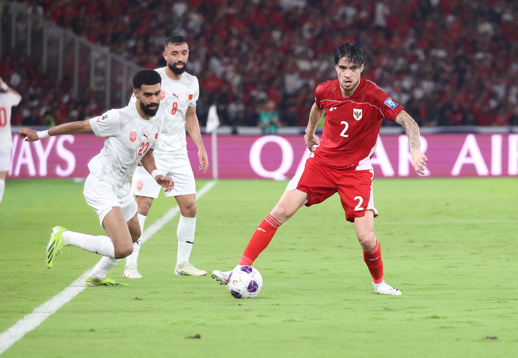 Pemain Indonesia Kevin Diks (2) beradu bola atas dengan pemain Bahrain saat pertandingan melawan Bahrain di pertandingan putaran ketiga Kualifikasi Piala Dunia 2026 di Stadion Utama Gelora Bung Karno, Senayan, Jakarta, Selasa, 25 Maret 2025.