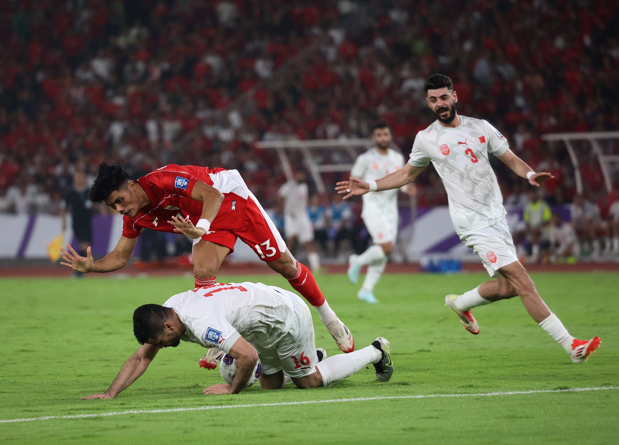 Pemain Indonesia Kevin Diks (2) beradu bola atas dengan pemain Bahrain saat pertandingan melawan Bahrain di pertandingan putaran ketiga Kualifikasi Piala Dunia 2026 di Stadion Utama Gelora Bung Karno, Senayan, Jakarta, Selasa, 25 Maret 2025.