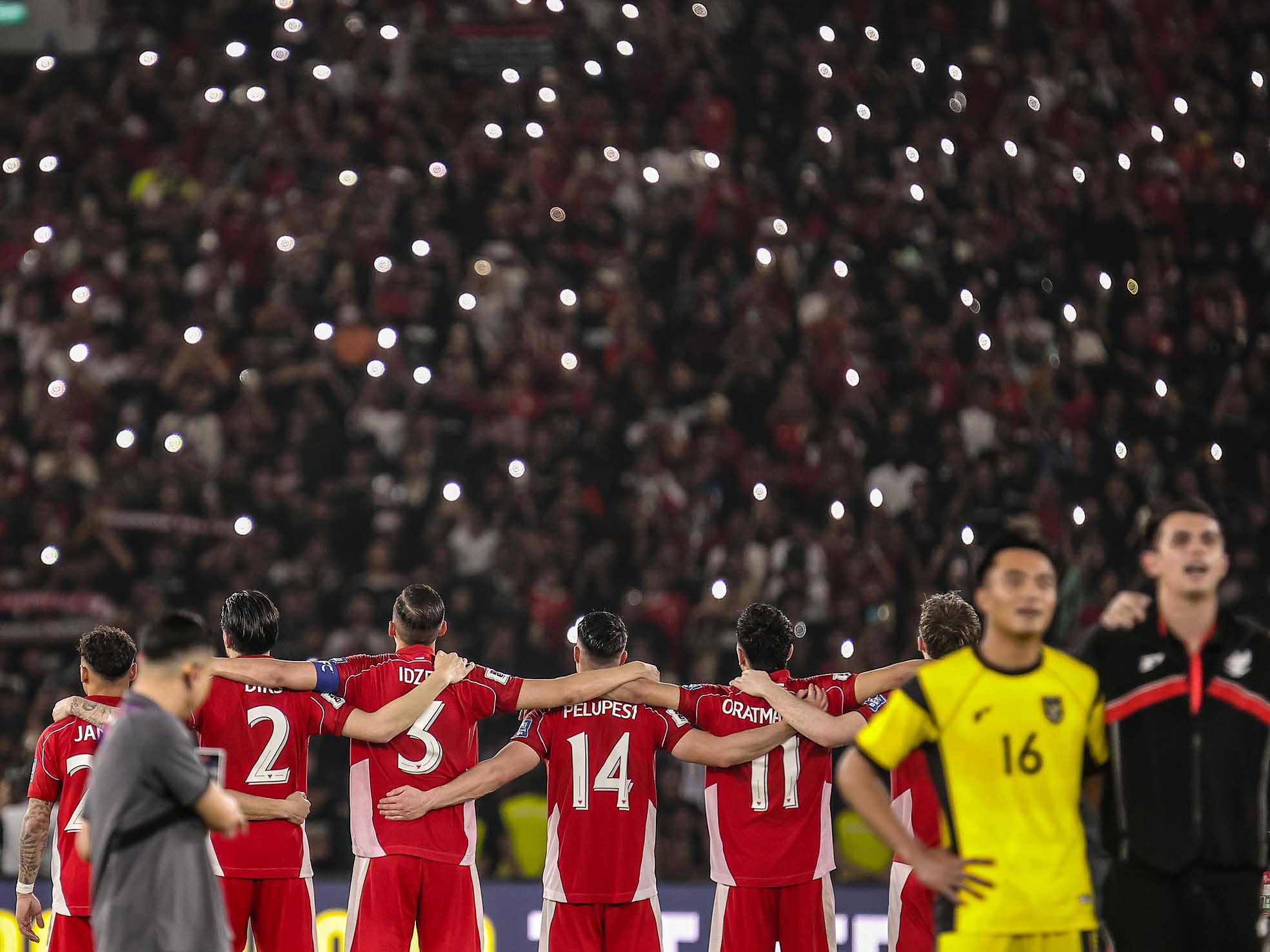 Skuad Timnas Indonesia menyanyikan lagu Tanah Airku bersama suporter usai menghadapi Timnas Bahrain pada laga Grup C putaran ketiga Kualifikasi Piala Dunia 2026 Zona Asia di Stadion Utama Gelora Bung Karno, Senayan, Jakarta, Selasa (25/3/2025). Foto : Ady Sesotya/sportsmoment.id