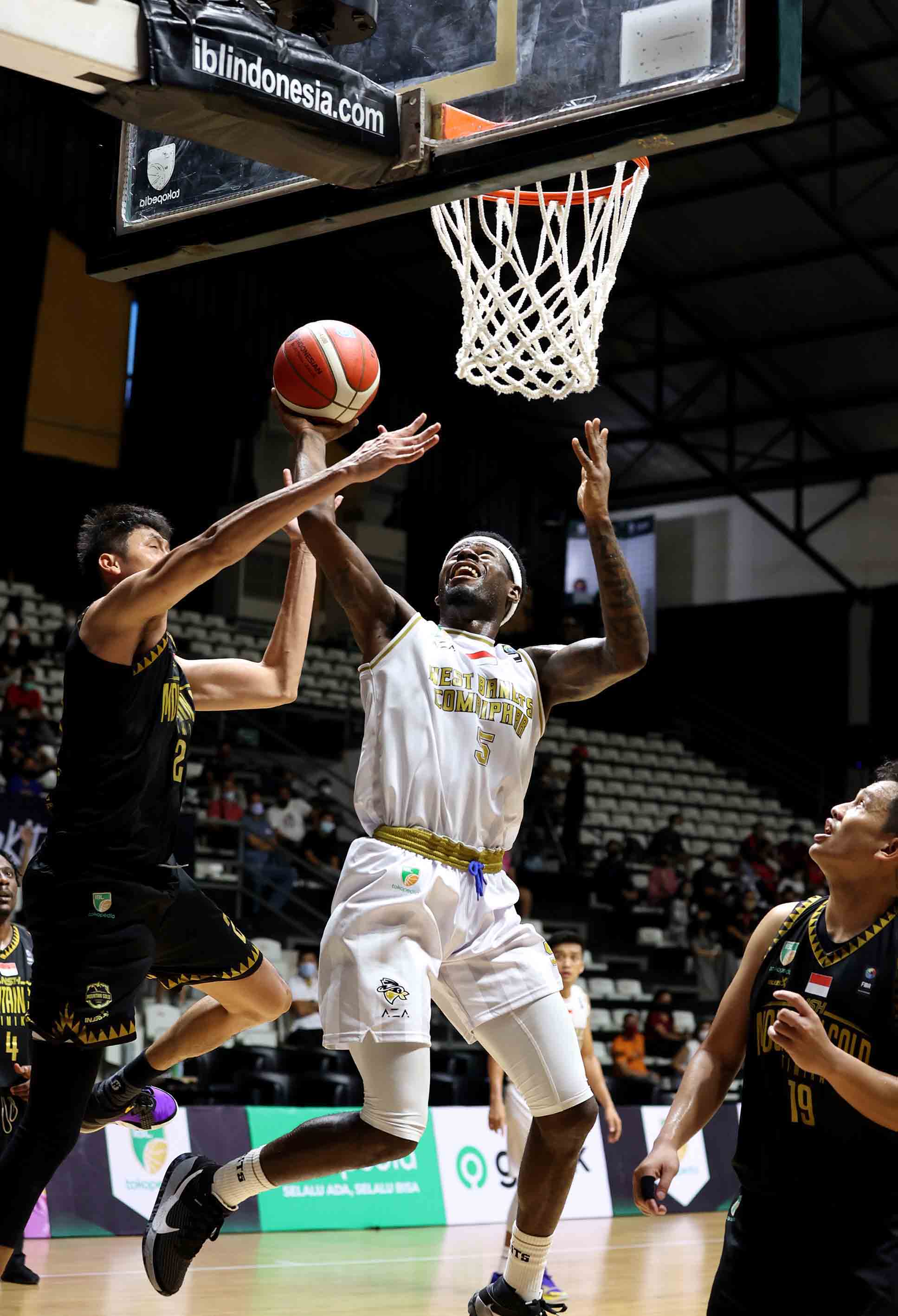 Michael Ayodele Kolawole (5) pemain West Bandits Combiphar Solo mendapat hadangan dari pemain NSH Mountain Gold Timika. West Bandits Combiphar Solo melawan NSH Mountain Gold Timika pada pertandingan Seri 1 Jakarta Indonesian Basketball League (IBL) 2022 di Hall Basket GBK, Jakarta, Rabu (19/1/2022). West Bandits Combiphar Solo kalah oleh NSH Mountain Gold Timika dengan skor 67-69. (Photo : Bobby Arifin)
