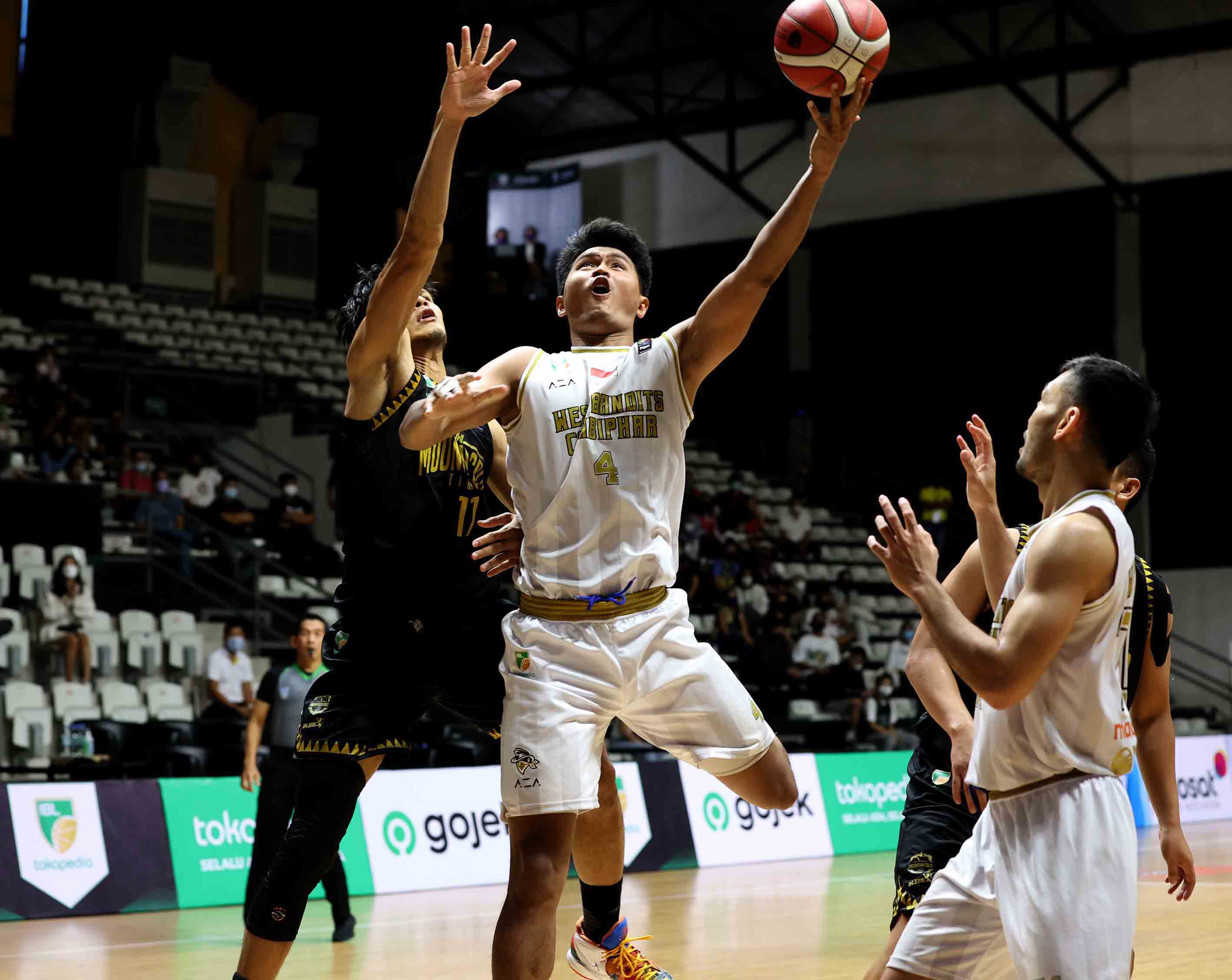 Habib Tito Aji (4) pemain West Bandits Combiphar Solo mendapat hadangan dari pemain NSH Mountain Gold Timika, Andre Rorimpandey (11). West Bandits Combiphar Solo melawan NSH Mountain Gold Timika pada pertandingan Seri 1 Jakarta Indonesian Basketball League (IBL) 2022 di Hall Basket GBK, Jakarta, Rabu (19/1/2022). West Bandits Combiphar Solo kalah oleh NSH Mountain Gold Timika dengan skor 67-69. (Photo : Bobby Arifin)