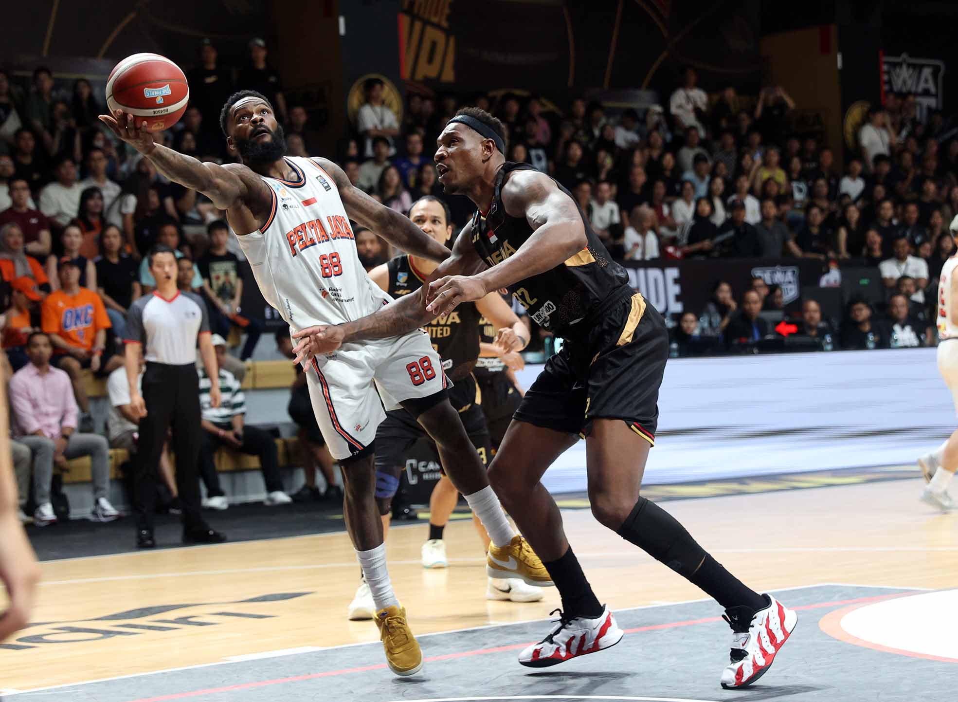 Jerome Anthony Beane JR melepaskan bola ke arah ring Dewa United yang dijaga oleh Lester Prosper di Final IBL 2025 Game ke-1 di markas Dewa United Tangerang, mempertandingkan Dewa United vs Pelita Jaya berakhir dengan skor 77-94.