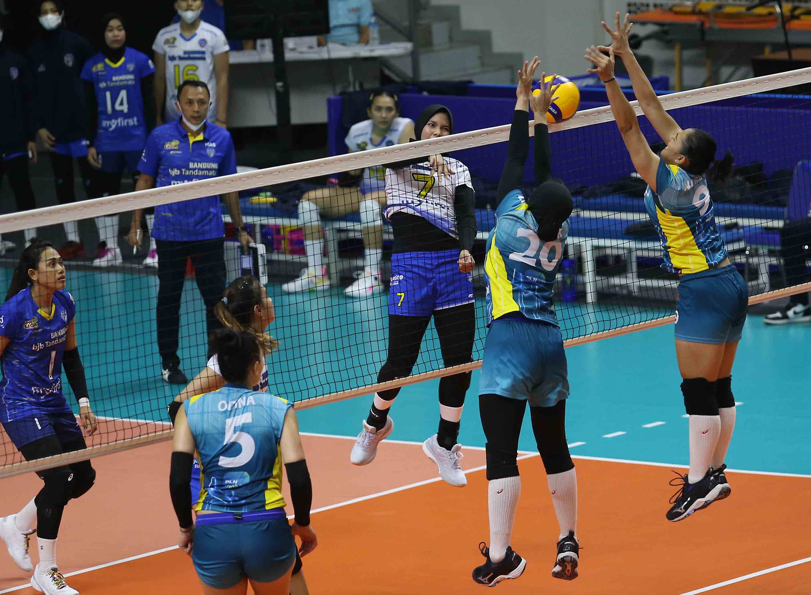 Tim bola voli putri Bandung BJB Tandamata berhasil menang atas Jakarta Elektrik PLN dengan skor 3-2 (25-22, 25-23,18-25, 21-25, 15-10). Pertandingan Proliga 2022 putaran kedua yang berlangsung di GOR Padepokan Voli Jenderal Polisi Kunarto, Sentul, Jumat (18/2/2022). (Foto : Erly Bahtiar/Sportsmoment.id)