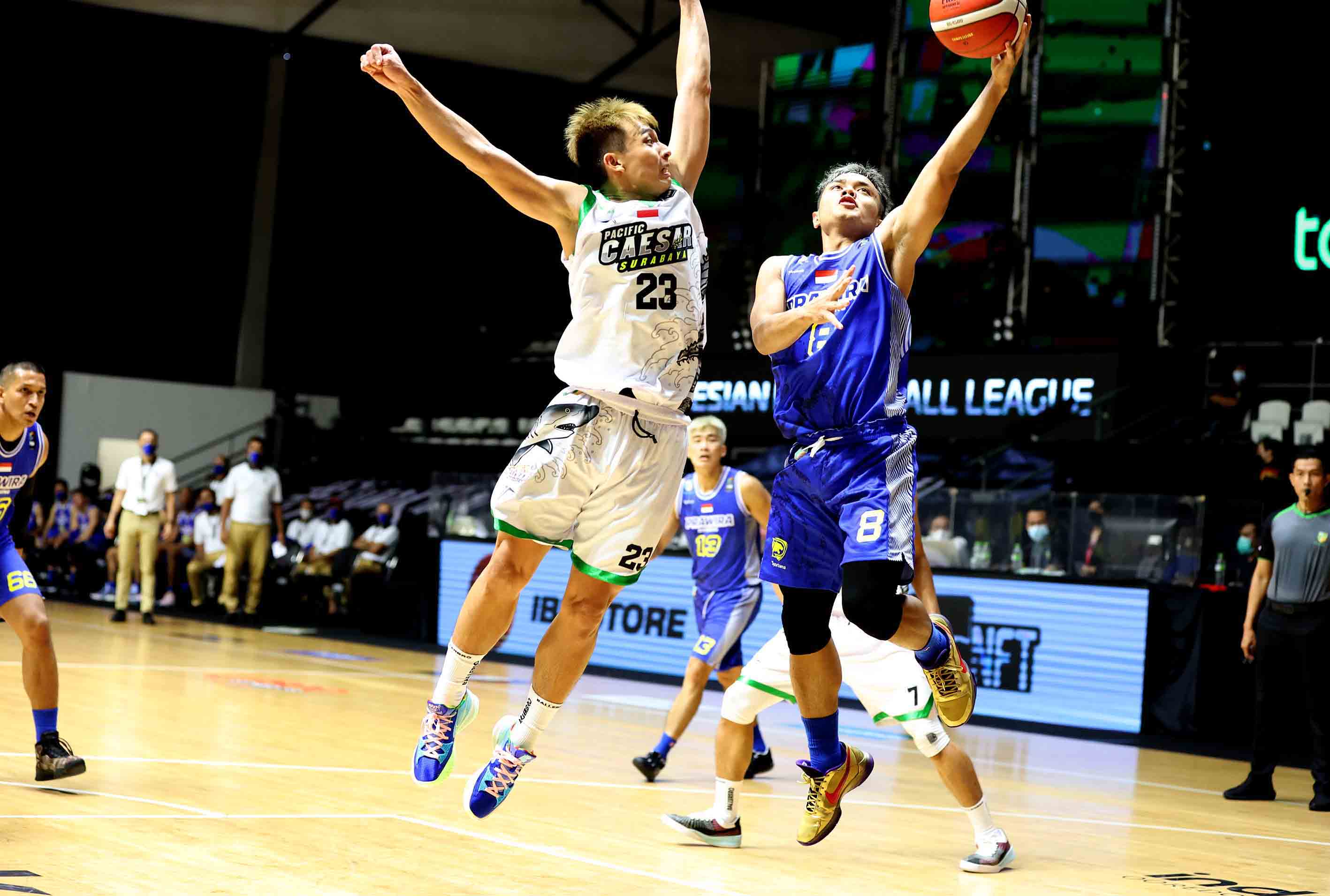 Yudha Saputera (8) pemain Prawira Bandung mendapat kawalan dari pemain Pacific Caesar Surabaya, Calvin Chrissler (23). Prawira Bandung melawan Pacific Caesar Surabaya pada pertandingan Seri 1 Jakarta Indonesian Basketball League (IBL) 2022 di Hall Basket GBK, Jakarta, Sabtu (15/1/2022). Prawira Bandung menang atas Pacific Caesar Surabaya dengan skor 71-54. (Photo : Bobby Arifin)