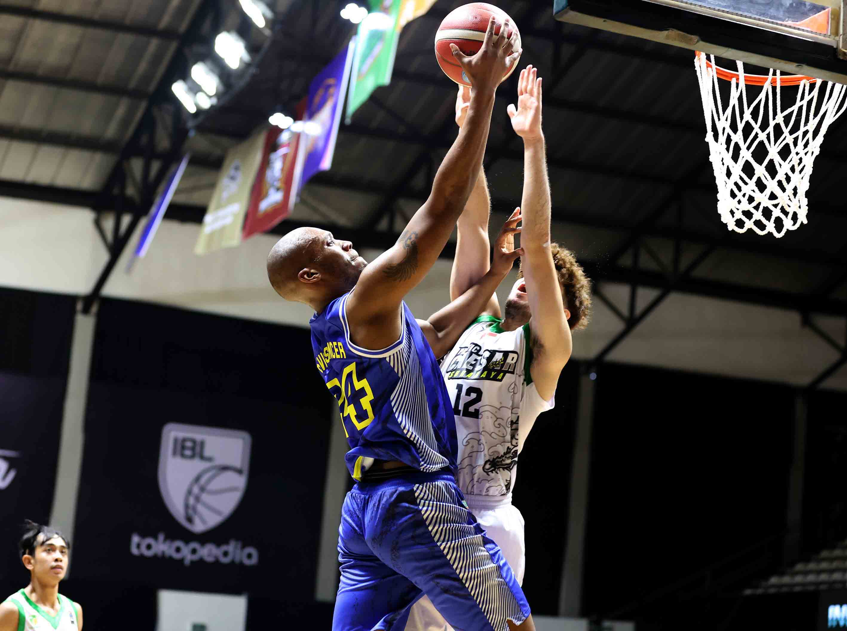 Taj Davis Spencer (biru) pemain Prawira Bandung mendapat hadangan dari pemain Pacific Caesar Surabaya, Yonatan (putih). Prawira Bandung melawan Pacific Caesar Surabaya pada pertandingan Seri 1 Jakarta Indonesian Basketball League (IBL) 2022 di Hall Basket GBK, Jakarta, Sabtu (15/1/2022). Prawira Bandung menang atas Pacific Caesar Surabaya dengan skor 71-54. (Photo : Bobby Arifin)