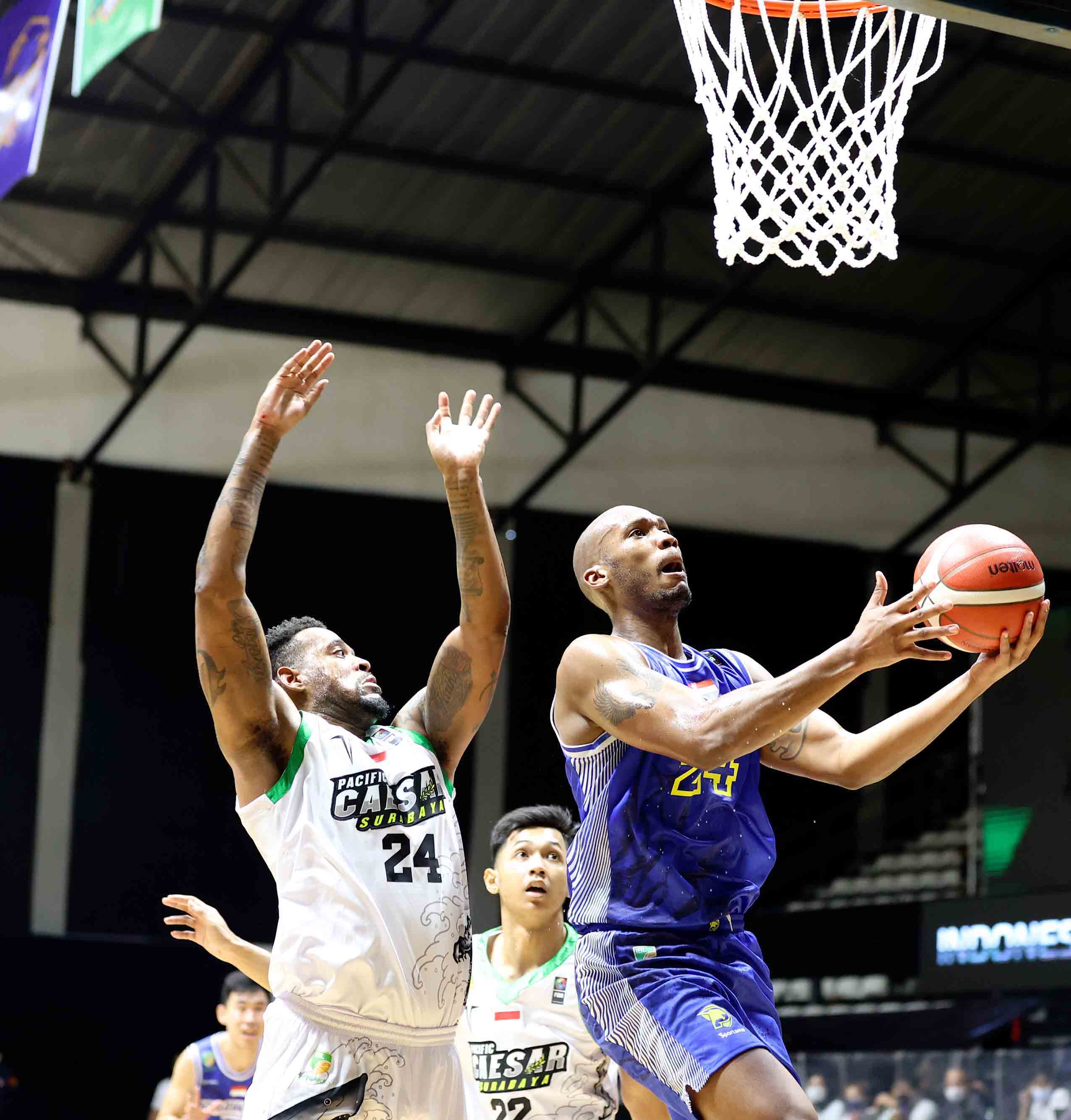 Taj Davis Spencer (biru) pemain Prawira Bandung melempar bola ke arah ring Pacific Caesar Surabaya. Prawira Bandung melawan Pacific Caesar Surabaya pada pertandingan Seri 1 Jakarta Indonesian Basketball League (IBL) 2022 di Hall Basket GBK, Jakarta, Sabtu (15/1/2022). Prawira Bandung menang atas Pacific Caesar Surabaya dengan skor 71-54. (Photo : Bobby Arifin)