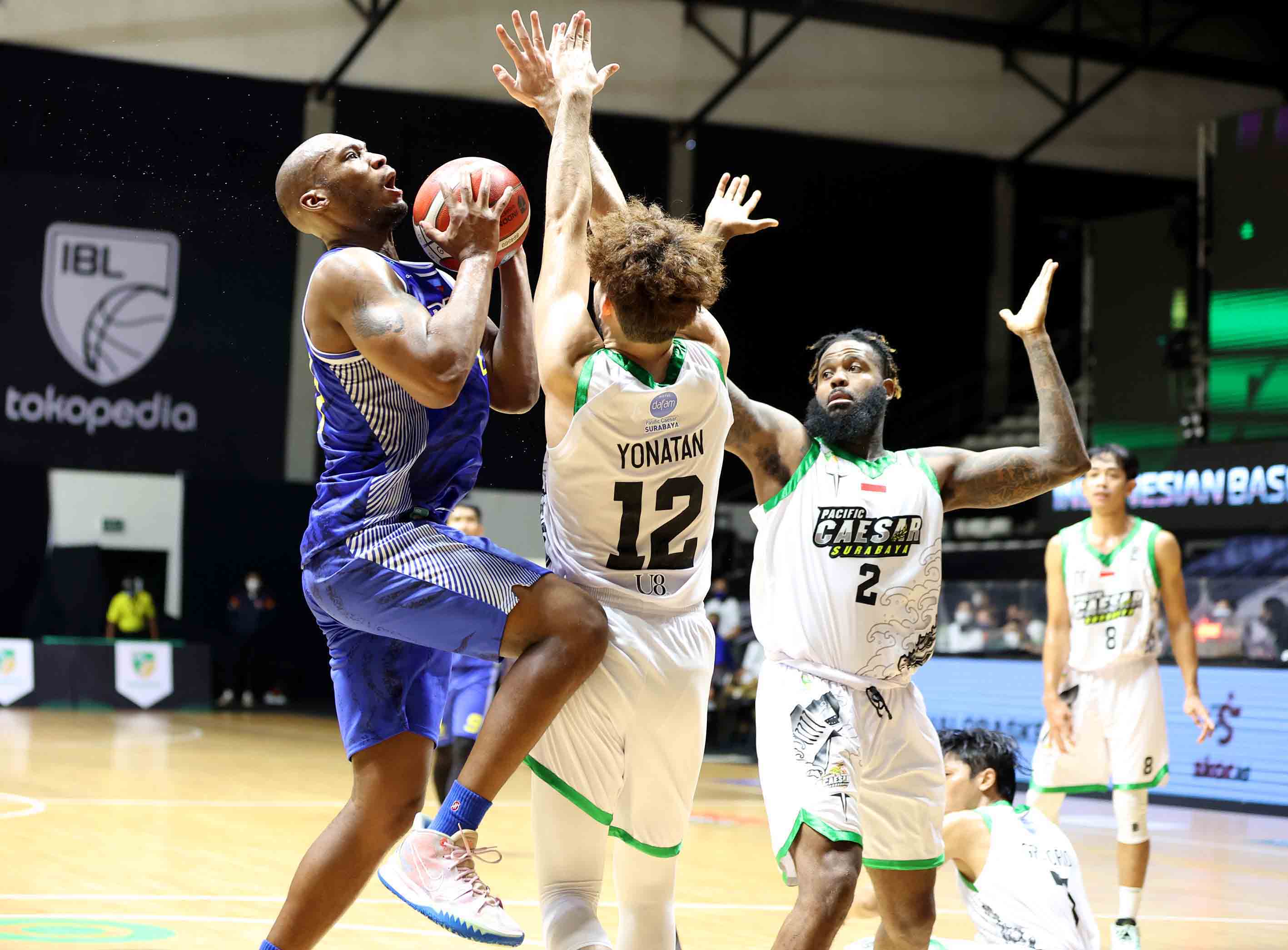 Taj Davis Spencer (biru) pemain Prawira Bandung mendapat hadangan dari pemain Pacific Caesar Surabaya, Yonatan (12). Prawira Bandung melawan Pacific Caesar Surabaya pada pertandingan Seri 1 Jakarta Indonesian Basketball League (IBL) 2022 di Hall Basket GBK, Jakarta, Sabtu (15/1/2022). Prawira Bandung menang atas Pacific Caesar Surabaya dengan skor 71-54. (Photo : Bobby Arifin)