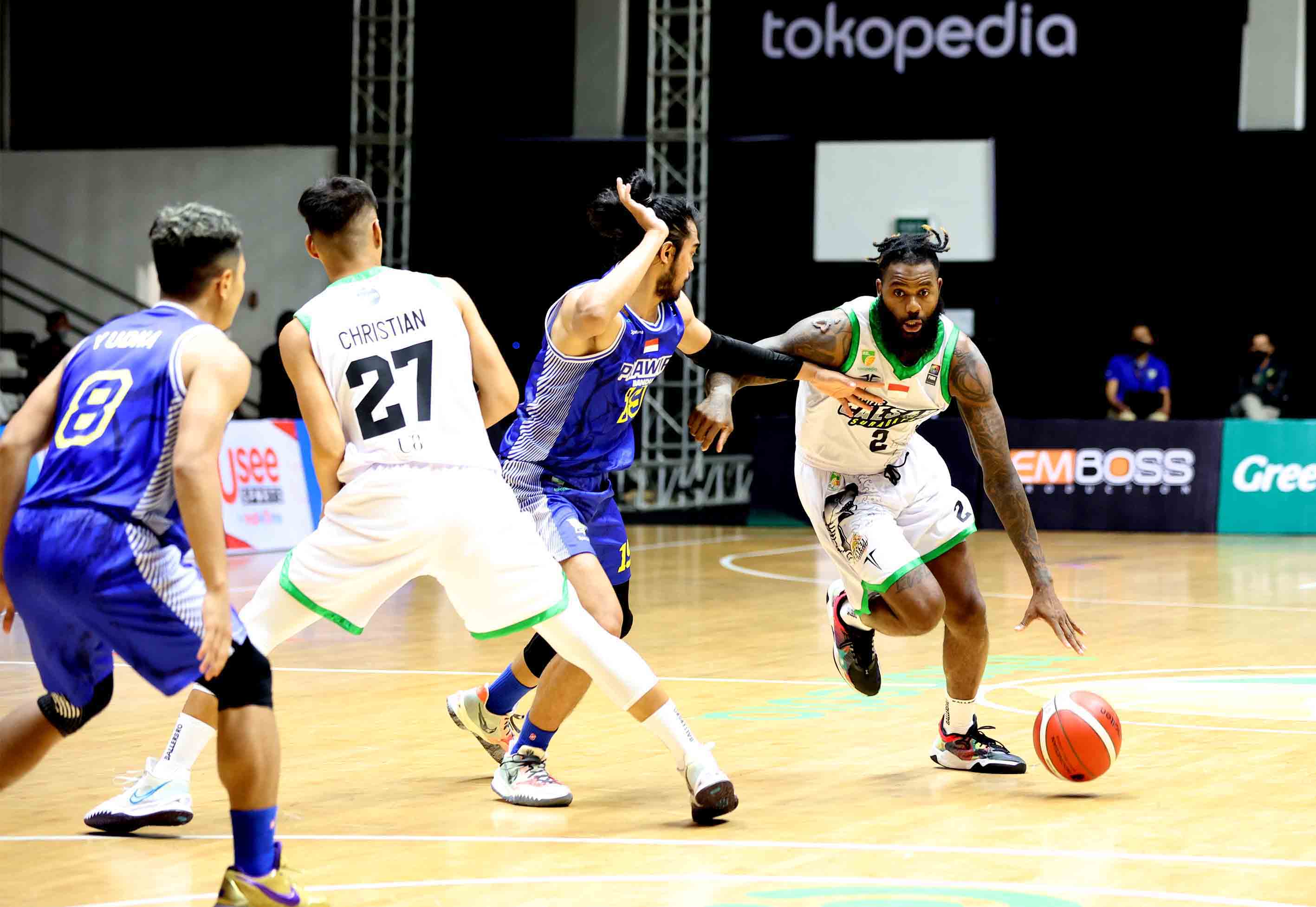 Akeem Garfield Ellis (2) pemain Pacific Caesar Surabaya mendapat hadangan dari pemain Prawira Bandung, BM. Reza Fahdani Guntara (19). Pacific Caesar Surabaya melawan Prawira Bandung pada pertandingan Seri 1 Jakarta Indonesian Basketball League (IBL) 2022 di Hall Basket GBK, Jakarta, Sabtu (15/1/2022). Pacific Caesar Surabaya kalah oleh Prawira Bandung dengan skor 54-71. (Photo : Bobby Arifin)