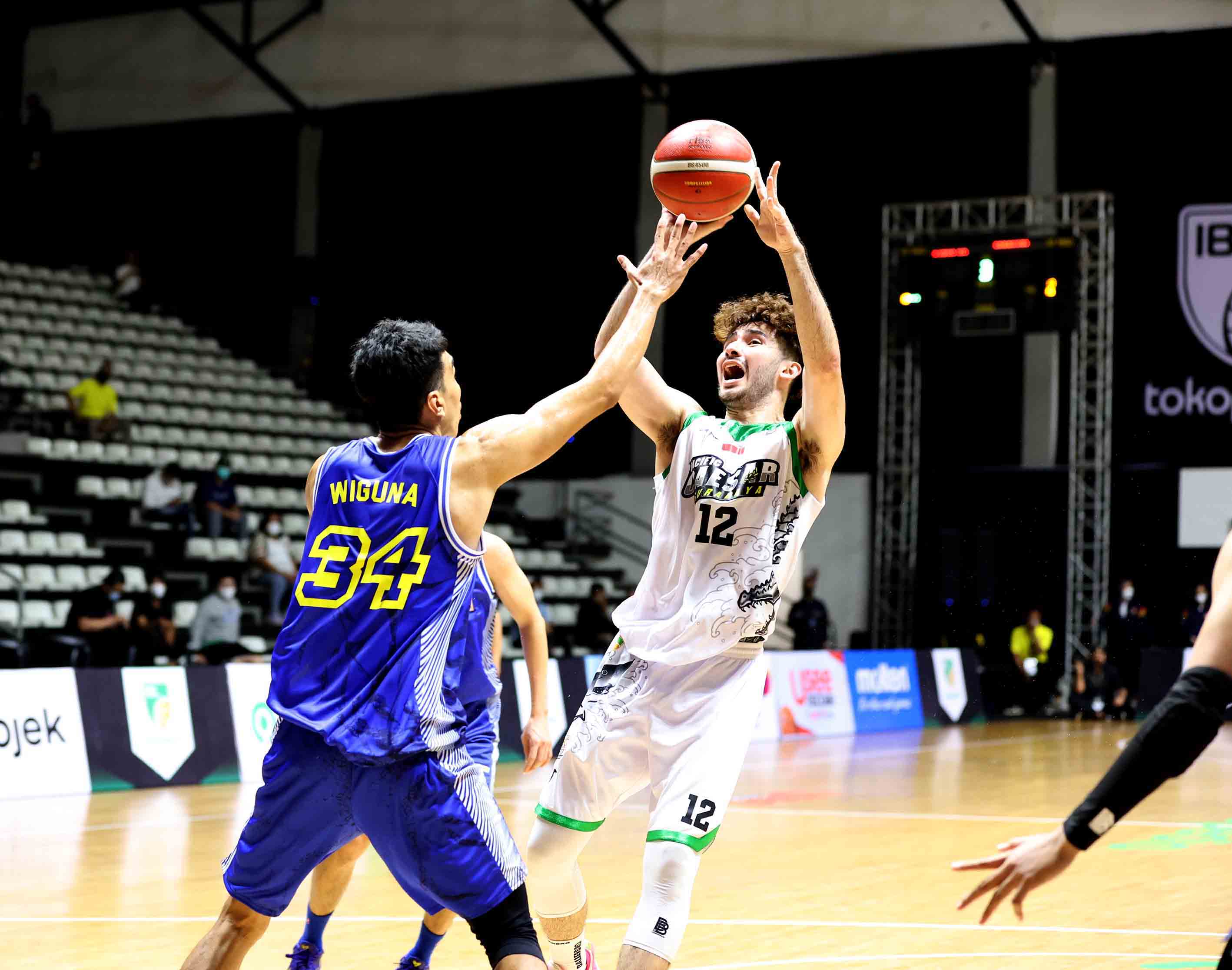 Yonatan (12) pemain Pacific Caesar Surabaya mendapat hadangan dari pemain Prawira Bandung, Pandu Wiguna (34). Pacific Caesar Surabaya melawan Prawira Bandung pada pertandingan Seri 1 Jakarta Indonesian Basketball League (IBL) 2022 di Hall Basket GBK, Jakarta, Sabtu (15/1/2022). Pacific Caesar Surabaya kalah oleh Prawira Bandung dengan skor 54-71. (Photo : Bobby Arifin)
