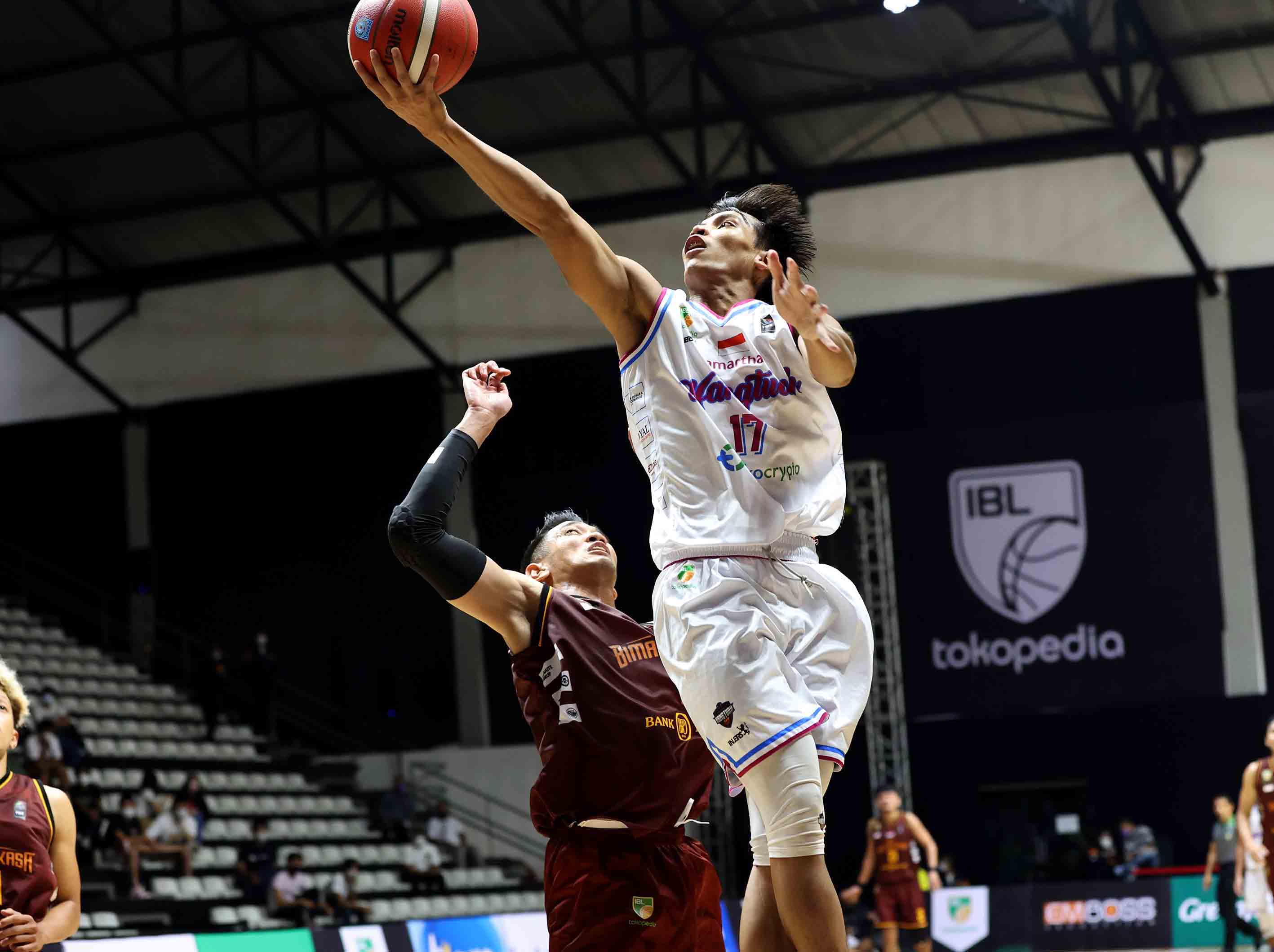 Fisyaiful Amir (17) pemain Amartha Hangtuah Jakarta bersiap melempar bola ke arah ring DNA Bima Perkasa Jogja. Amartha Hangtuah Jakarta melawan DNA Bima Perkasa Jogja pada pertandingan Seri 1 Jakarta Indonesian Basketball League (IBL) 2022 di Hall Basket GBK, Jakarta, Selasa (18/1/2022). Amartha Hangtuah Jakarta menang atas DNA Bima Perkasa Jogja dengan skor 68-53. (Photo : Bobby Arifin),