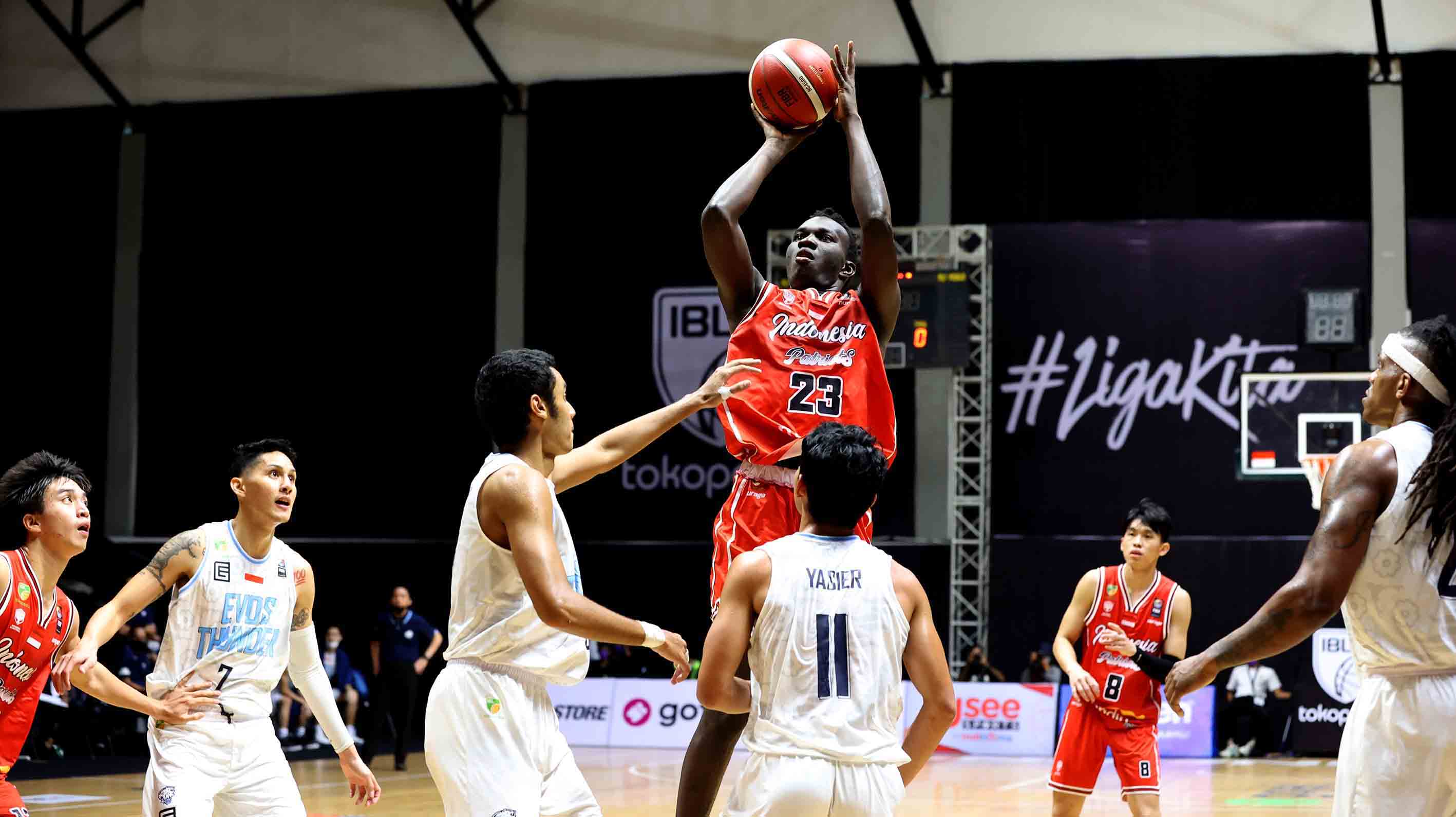 Serigne Modou Kane (23) pemain Indonesia Patriots melempar bola ke arah ring Evos Thunder Bogor. Indonesia Patriots melawan Evos Thunder Bogor pada pertandingan Seri 1 Jakarta Indonesian Basketball League (IBL) 2022 di Hall Basket GBK, Jakarta, Selasa (18/1/2022). Indonesia Patriots menang atas Evos Thunder Bogor dengan skor 58-53. (Foto : Bobby Arifin)