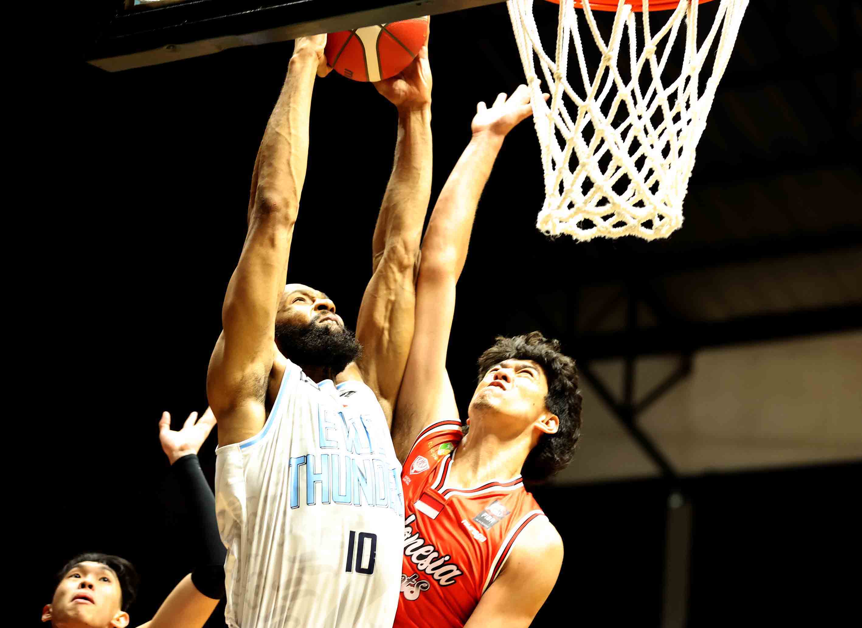Karamoko Sokroka Cisse (10) pemain Evos Thunder Bogor mendapat hadangan dari pemain Indonesia Patriots. Evos Thunder Bogor melawan Indonesia Patriots pada pertandingan Seri 1 Jakarta Indonesian Basketball League (IBL) 2022 di Hall Basket GBK, Jakarta, Selasa (18/1/2022). Evos Thunder Bogor kalah oleh Indonesia Patriots dengan skor 53-58. (Photo : Bobby Arifin)