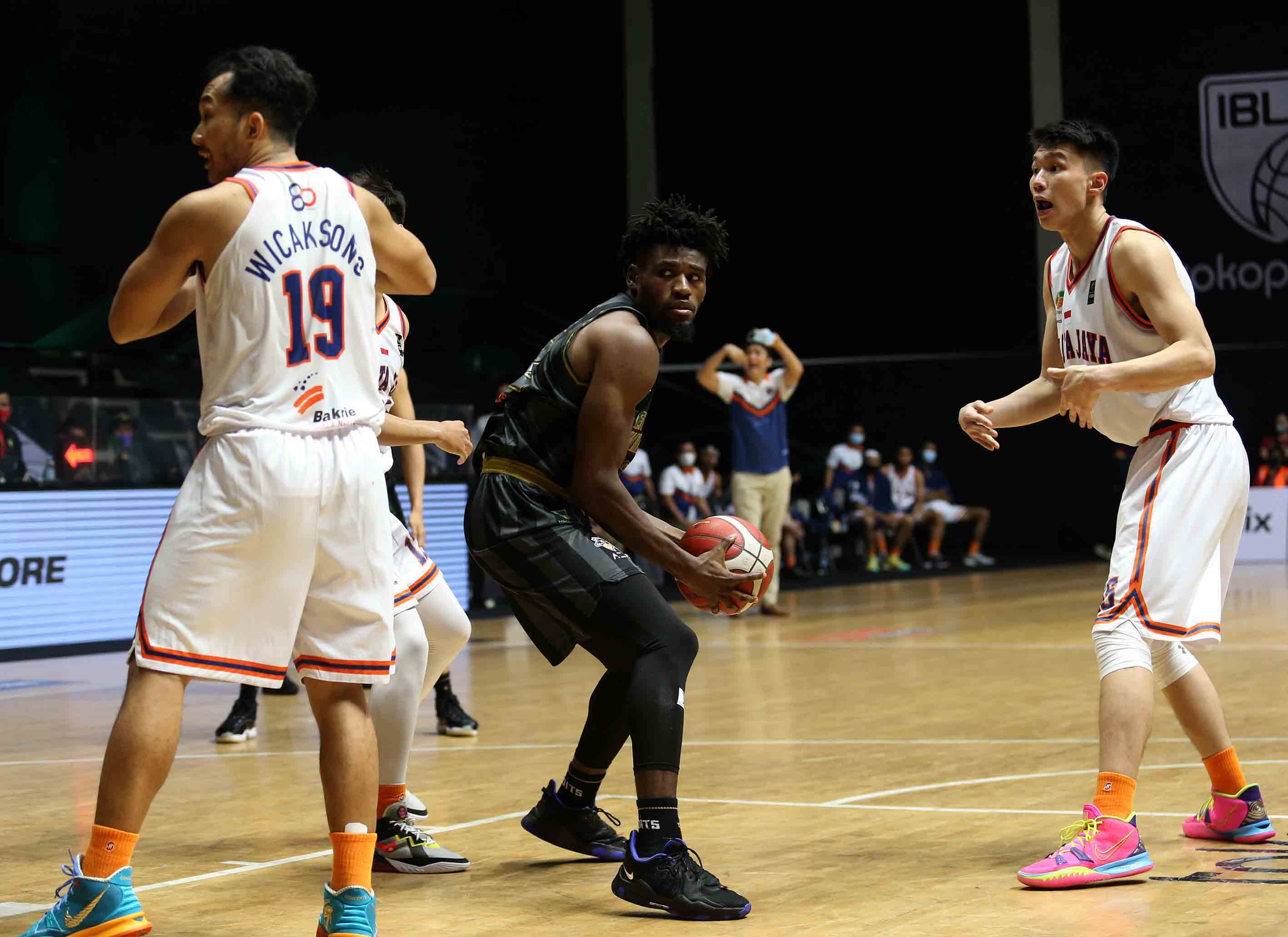 Dmonta Quoshawn Harris (32) pemain West Bandits Combiphar Solo mengamankan bola dari para pemain Pelita Jaya Bakrie. West Bandits Combiphar Solo melawan Pelita Jaya Bakrie pada pertandingan Seri 1 Jakarta Indonesian Basketball League (IBL) 2022 di Hall Basket GBK, Jakarta, Jum’at (21/1/2022). West Bandits Combiphar Solo kalah oleh Pelita Jaya Bakrie dengan skor 81-87. (Photo : Erly Bahtiar)