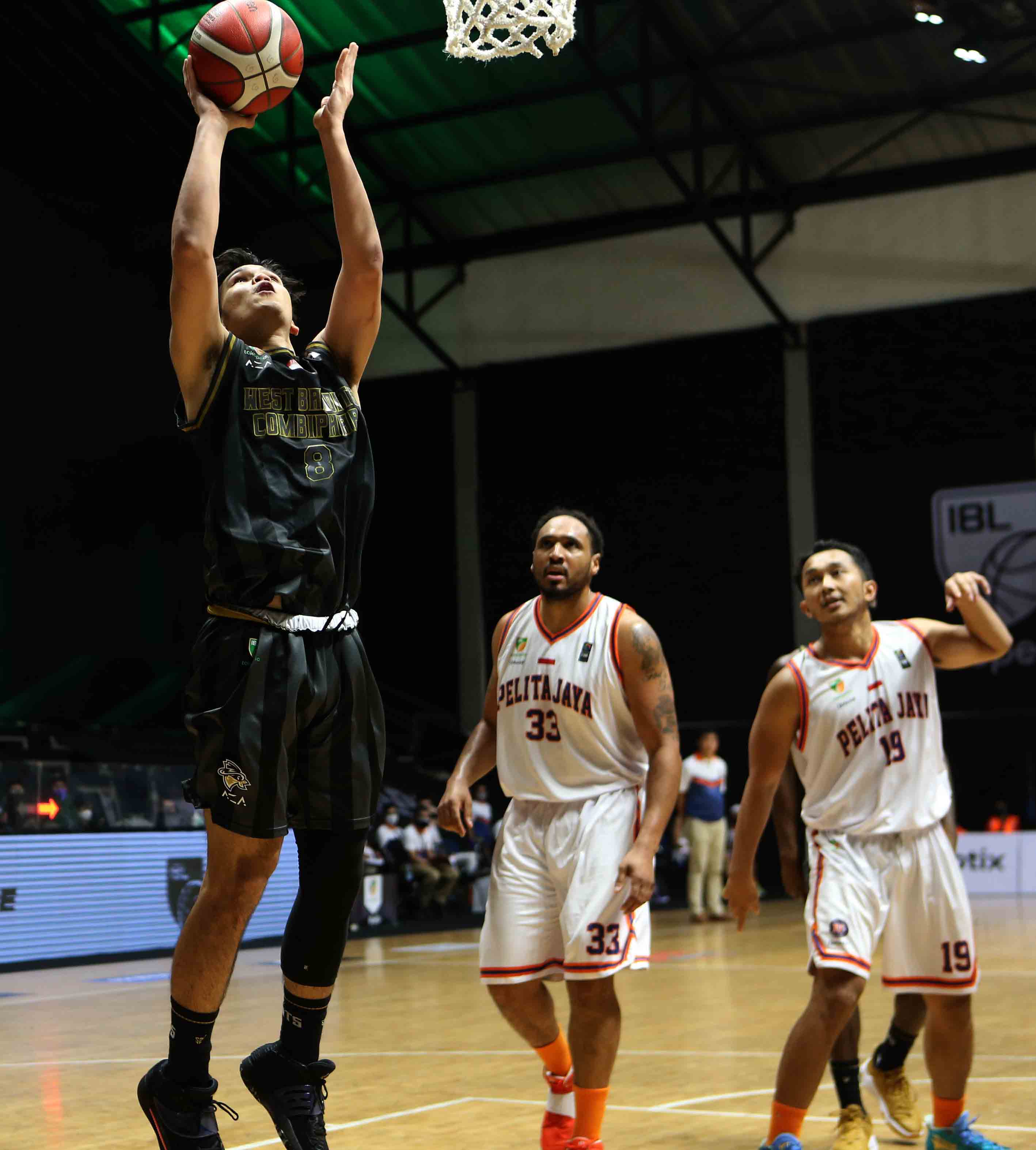 Patrick Nikolas (8) pemain West Bandits Combiphar Solo berusaha memasukkan bola ke ring Pelita Jaya Bakrie. West Bandits Combiphar Solo melawan Pelita Jaya Bakrie pada pertandingan Seri 1 Jakarta Indonesian Basketball League (IBL) 2022 di Hall Basket GBK, Jakarta, Jum’at (21/1/2022). West Bandits Combiphar Solo kalah oleh Pelita Jaya Bakrie dengan skor 81-87. (Photo : Erly Bahtiarsportsmoment.id)