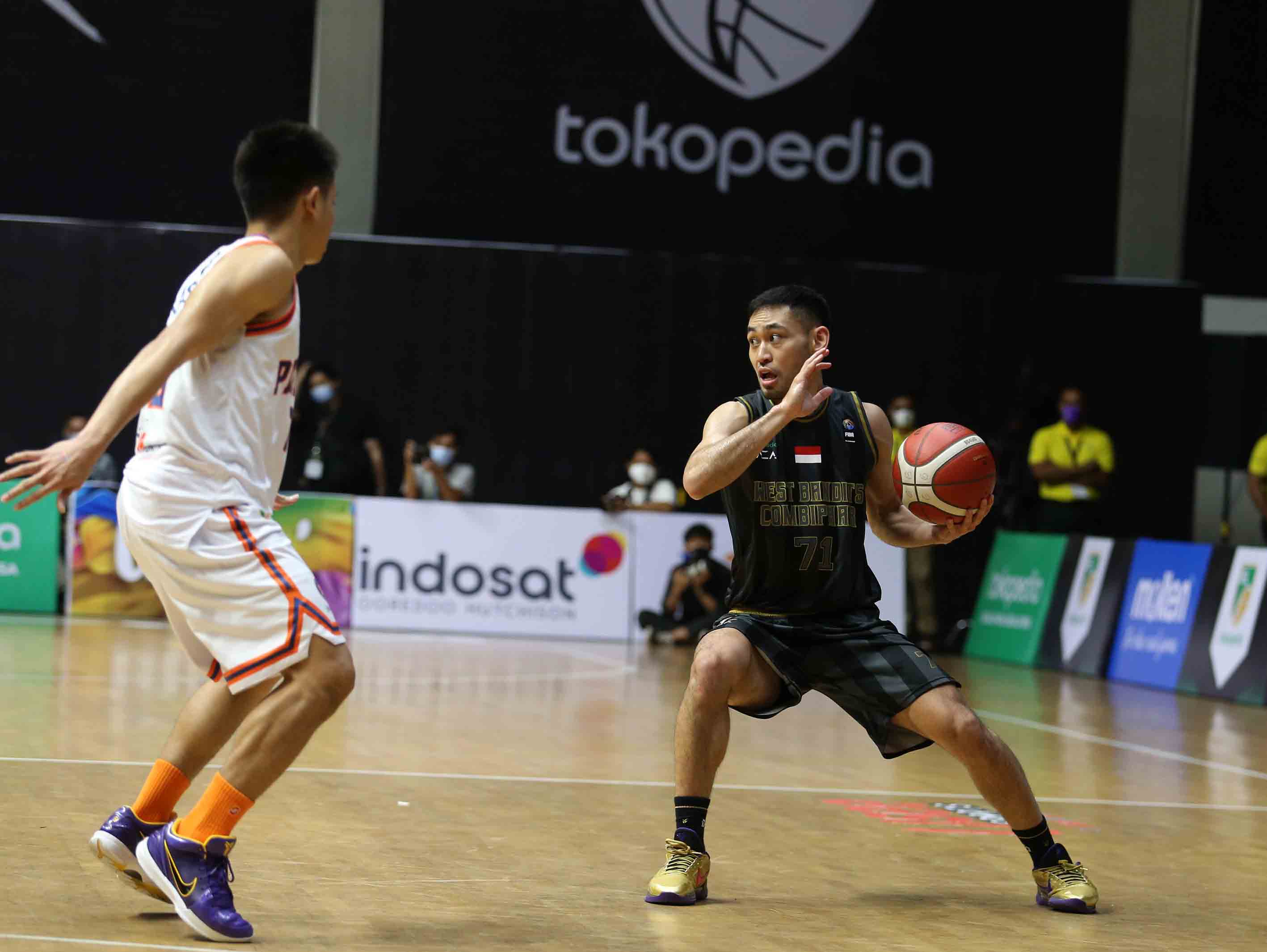 Widyanta Putra Teja (71) pemain West Bandits Combiphar Solo mendapat hadangan dari pemain Pelita Jaya Bakrie. West Bandits Combiphar Solo melawan Pelita Jaya Bakrie pada pertandingan Seri 1 Jakarta Indonesian Basketball League (IBL) 2022 di Hall Basket GBK, Jakarta, Jum’at (21/1/2022). West Bandits Combiphar Solo kalah oleh Pelita Jaya Bakrie dengan skor 81-87. (Photo : Erly Bahtiarsportsmoment.id),