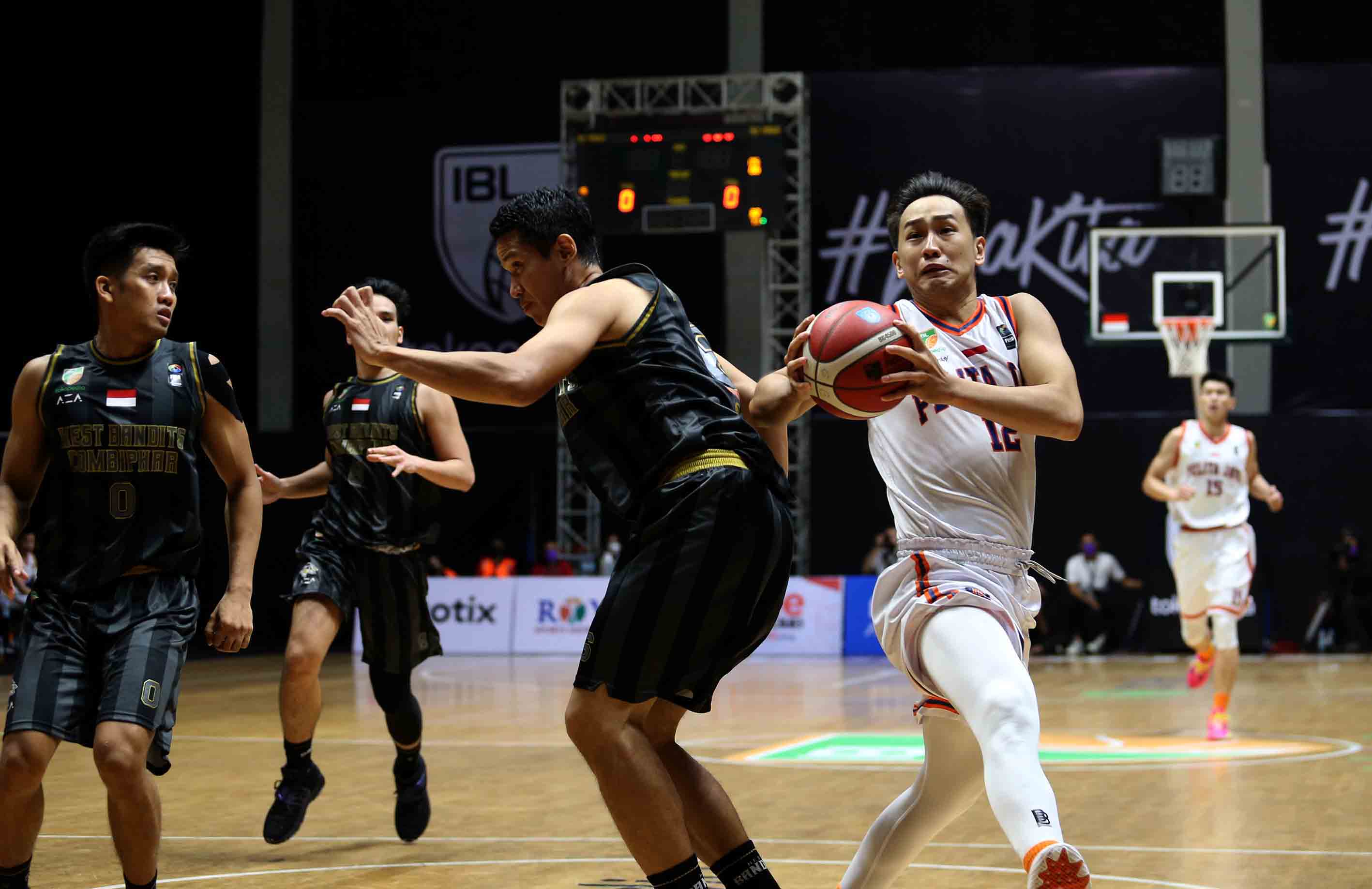 Reggie William Mononimbar (12) pemain Pelita Jaya Bakrie melewati hadangan dari pemain West Bandits Combiphar Solo. Pelita Jaya Bakrie melawan West Bandits Combiphar Solo pada pertandingan Seri 1 Jakarta Indonesian Basketball League (IBL) 2022 di Hall Basket GBK, Jakarta, Jum’at (21/1/2022).Pelita Jaya Bakrie menang atas West Bandits Combiphar Solo dengan skor 87-81. (Photo : Erly Bahtiar)