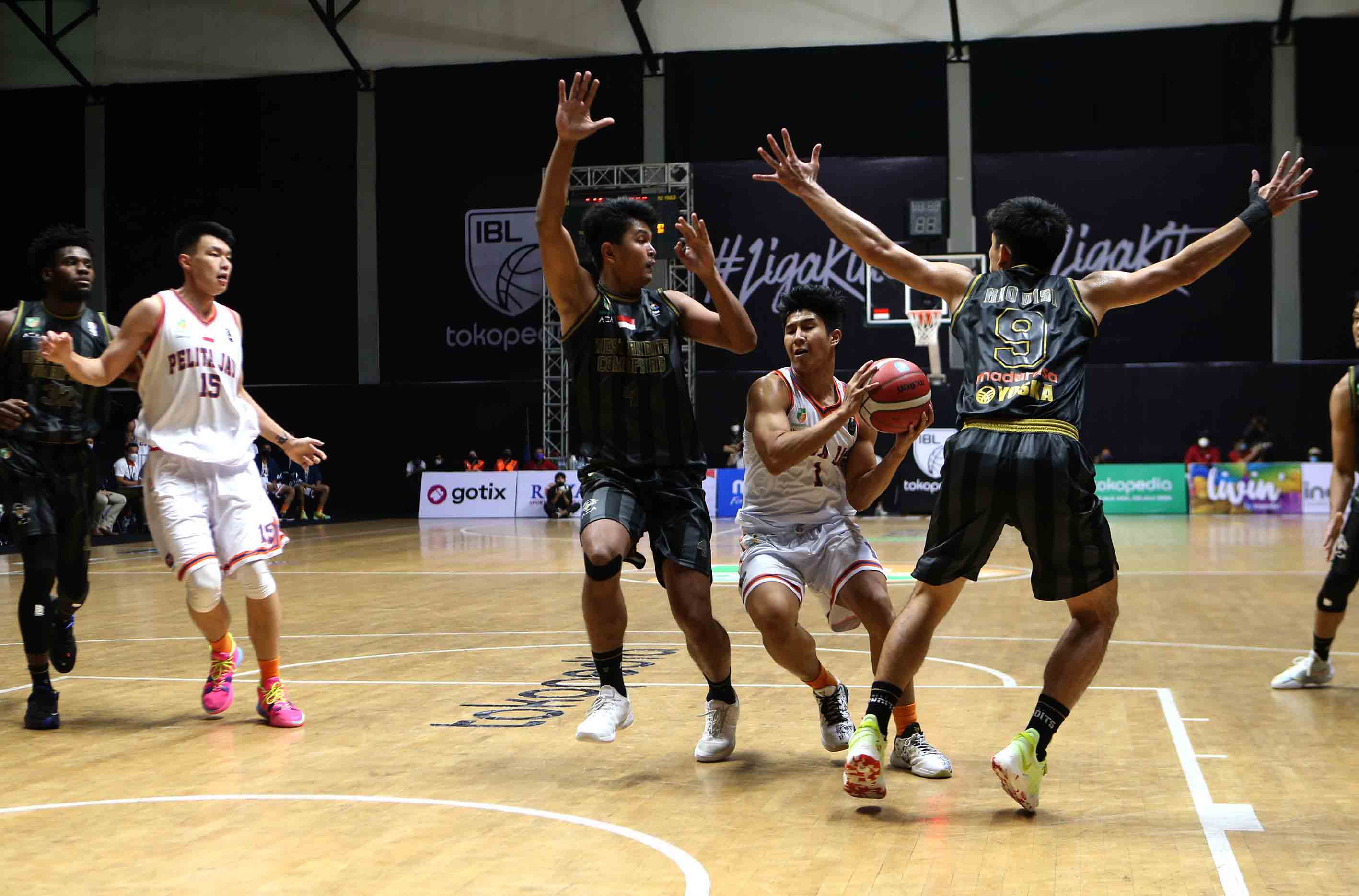 Muhamad Arighi (1) pemain Pelita Jaya Bakrie mendapat kawalan dari pemain West Bandits Combiphar Solo. Pelita Jaya Bakrie melawan West Bandits Combiphar Solo pada pertandingan Seri 1 Jakarta Indonesian Basketball League (IBL) 2022 di Hall Basket GBK, Jakarta, Jum’at (21/1/2022).Pelita Jaya Bakrie menang atas West Bandits Combiphar Solo dengan skor 87-81. (Photo : Erly Bahtiar)