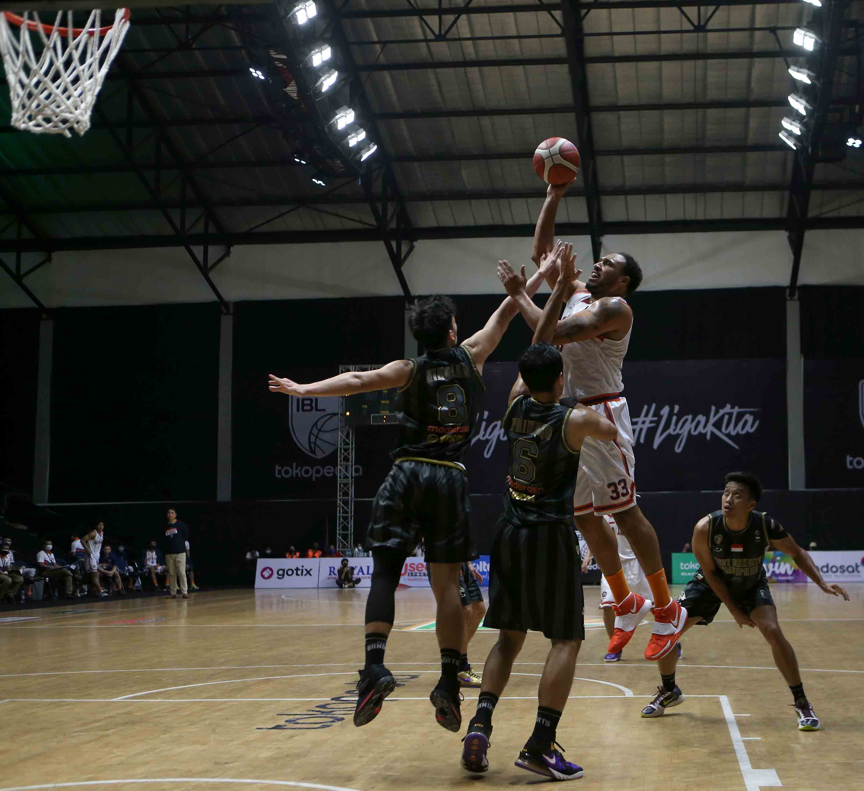 Dior Alexandros Lowhorn (33) pemain Pelita Jaya Bakrie berusaha memasukkan bola ke dalam ring West Bandits Combiphar Solo. Pelita Jaya Bakrie melawan West Bandits Combiphar Solo pada pertandingan Seri 1 Jakarta Indonesian Basketball League (IBL) 2022 di Hall Basket GBK, Jakarta, Jum’at (21/1/2022).Pelita Jaya Bakrie menang atas West Bandits Combiphar Solo dengan skor 87-81. (Photo : Erly Bahtiar)