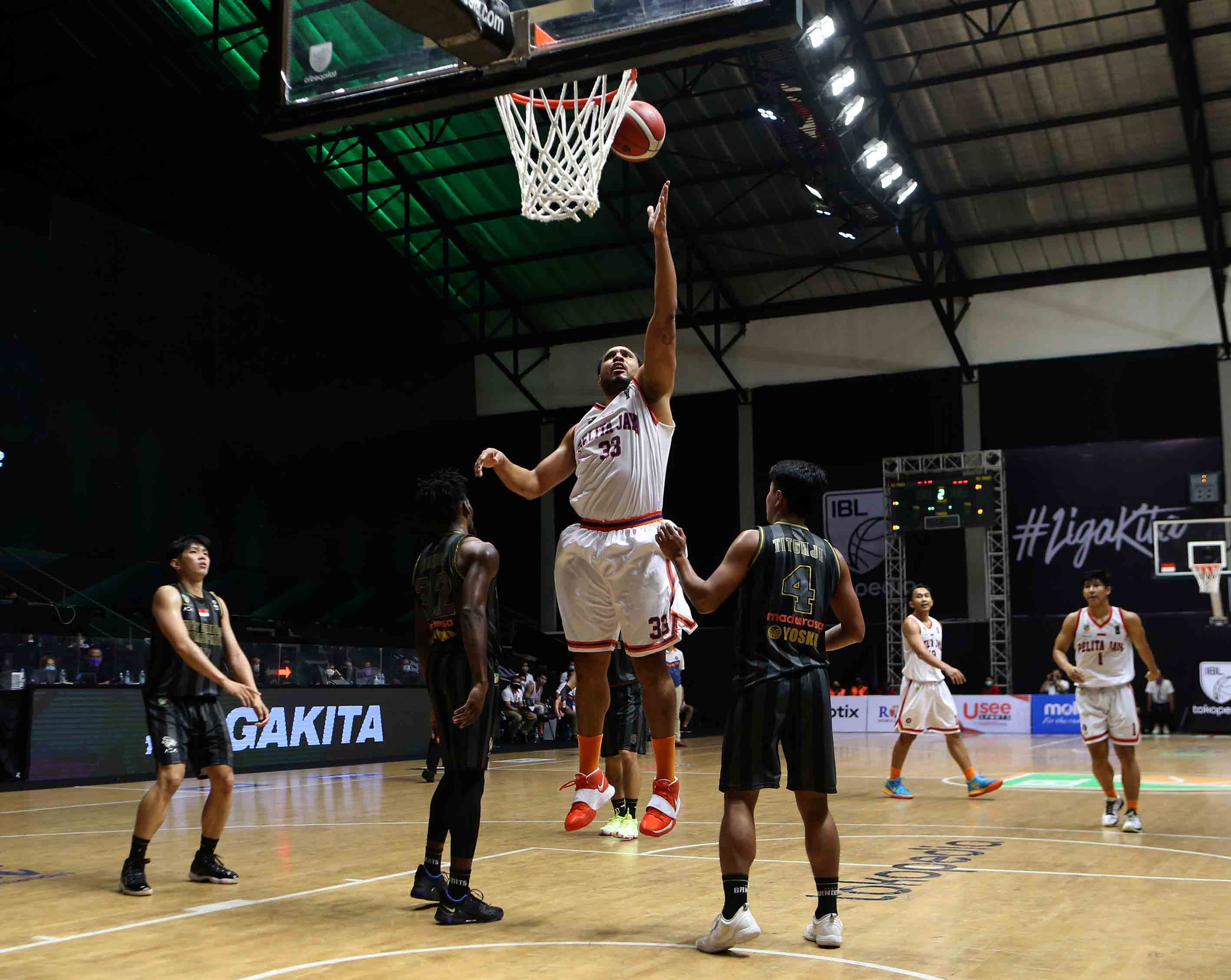 Dior Alexandros Lowhorn (33) pemain Pelita Jaya Bakrie memasukkan bola ke dalam ring West Bandits Combiphar Solo. Pelita Jaya Bakrie melawan West Bandits Combiphar Solo pada pertandingan Seri 1 Jakarta Indonesian Basketball League (IBL) 2022 di Hall Basket GBK, Jakarta, Jum’at (21/1/2022).Pelita Jaya Bakrie menang atas West Bandits Combiphar Solo dengan skor 87-81. (Photo : Erly Bahtiar)