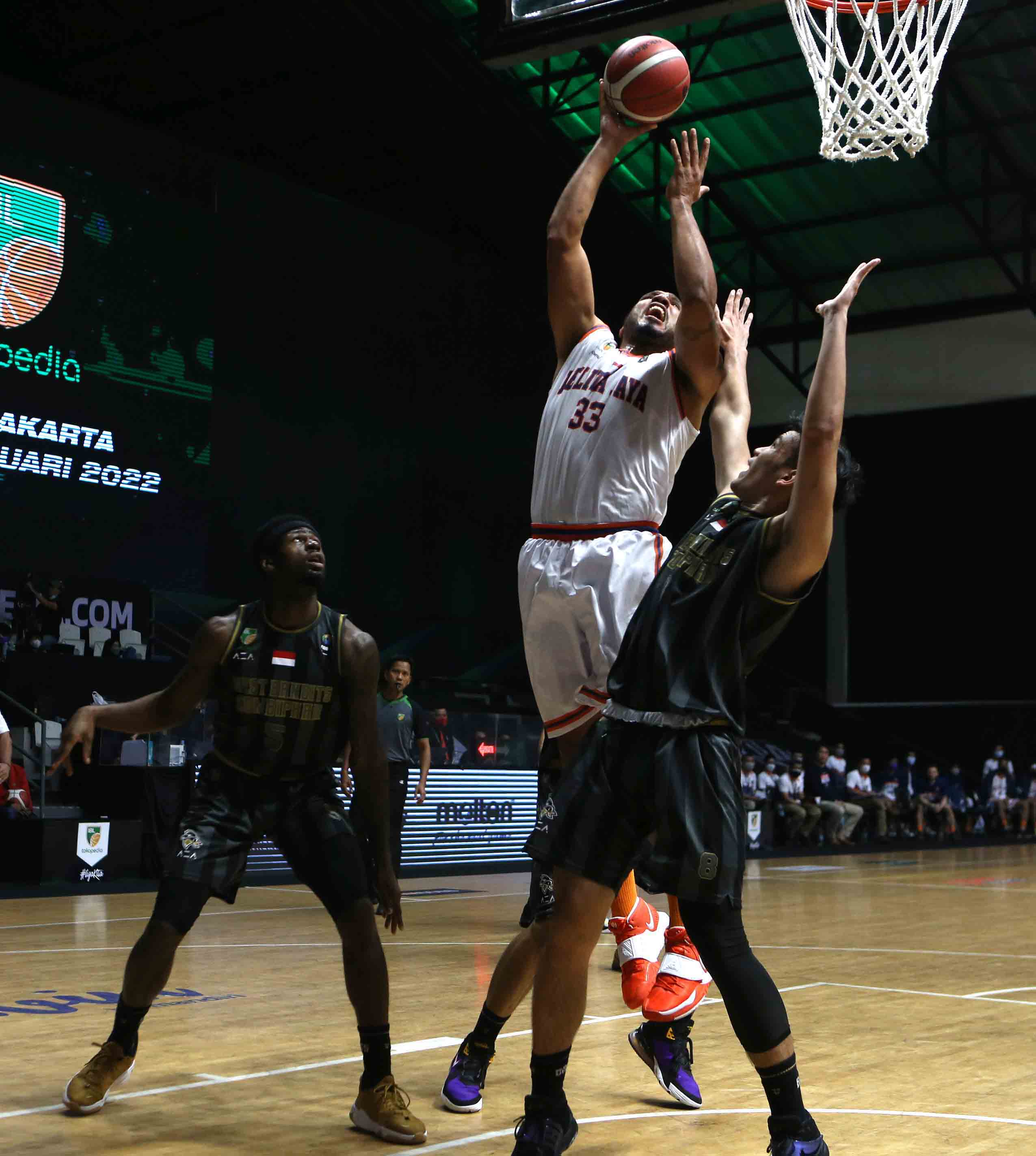Dior Alexandros Lowhorn (33) pemain Pelita Jaya Bakrie mendapat kawalan dari pemain West Bandits Combiphar Solo. Pelita Jaya Bakrie melawan West Bandits Combiphar Solo pada pertandingan Seri 1 Jakarta Indonesian Basketball League (IBL) 2022 di Hall Basket GBK, Jakarta, Jum’at (21/1/2022).Pelita Jaya Bakrie menang atas West Bandits Combiphar Solo dengan skor 87-81. (Photo : Erly Bahtiar)