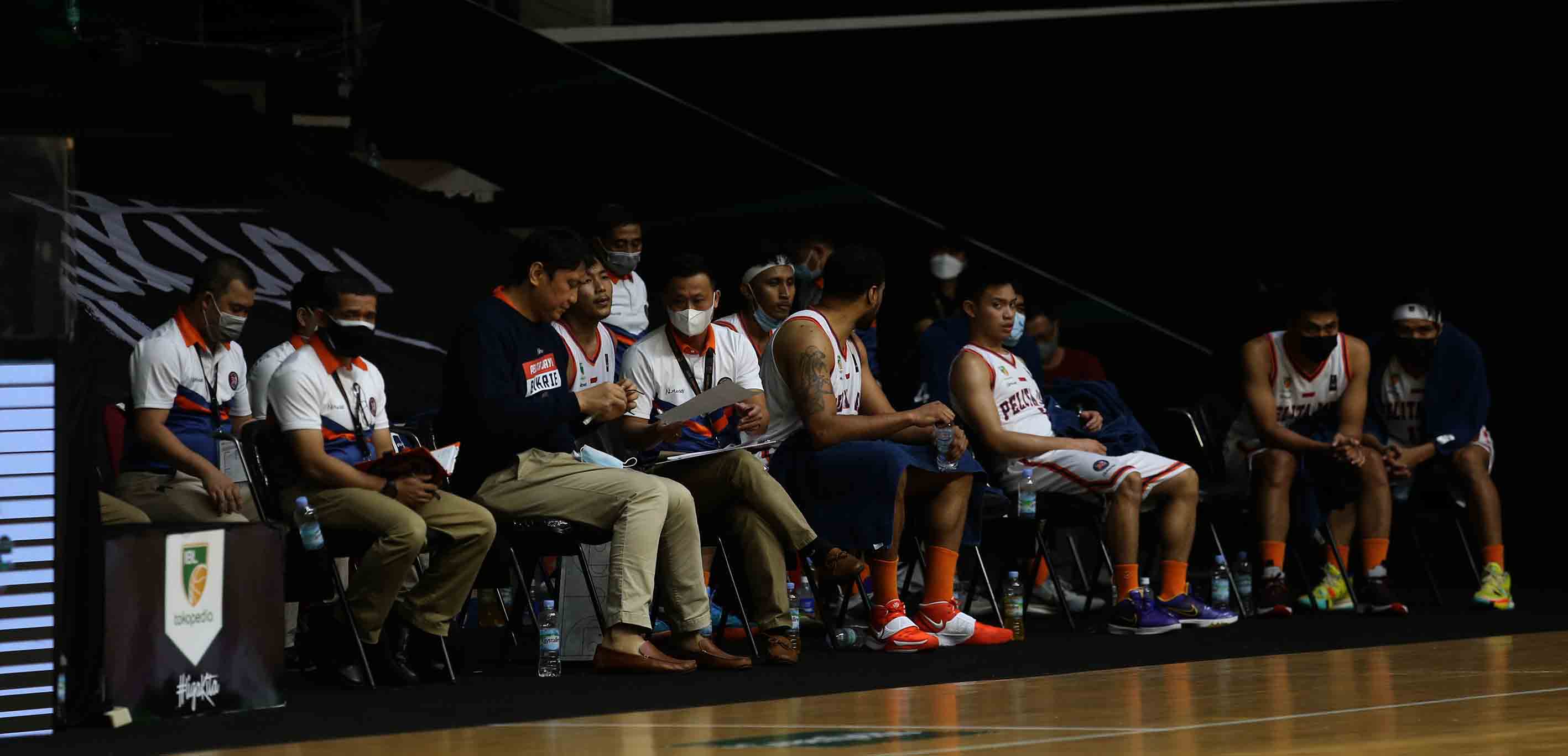 Pelatih Pelita Jaya Bakrie, Fictor Roring (hitam) sedang memberi arahan kepada anak asuhnya saat melawan West Bandits Combiphar Solo. Pelita Jaya Bakrie melawan West Bandits Combiphar Solo pada pertandingan Seri 1 Jakarta Indonesian Basketball League (IBL) 2022 di Hall Basket GBK, Jakarta, Jum’at (21/1/2022).Pelita Jaya Bakrie menang atas West Bandits Combiphar Solo dengan skor 87-81. (Photo : Erly Bahtiar)