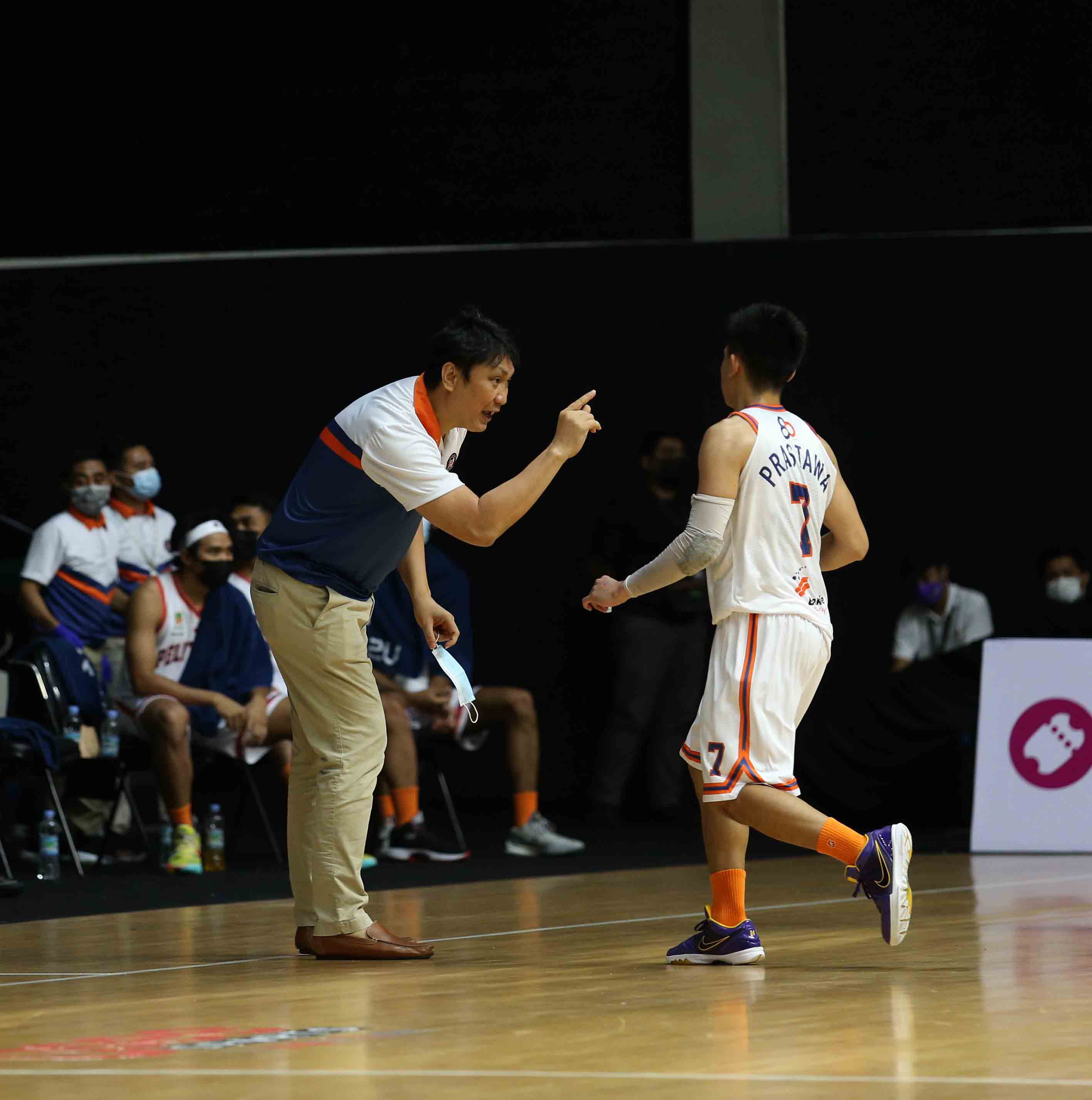 Pelatih Pelita Jaya Bakrie, Fictor Roring (kiri) sedang memberi arahan kepada anak asuhnya saat melawan West Bandits Combiphar Solo. Pelita Jaya Bakrie melawan West Bandits Combiphar Solo pada pertandingan Seri 1 Jakarta Indonesian Basketball League (IBL) 2022 di Hall Basket GBK, Jakarta, Jum’at (21/1/2022).Pelita Jaya Bakrie menang atas West Bandits Combiphar Solo dengan skor 87-81. (Photo : Erly Bahtiar)