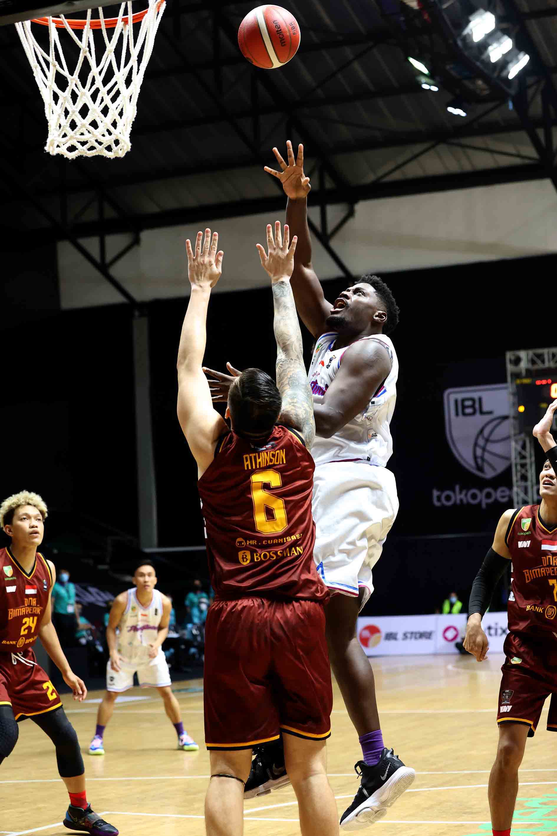 Anton Davon Waters Sr (15) pemain Amartha Hangtuah Jakarta melempar bola ke arah ring DNA Bima Perkasa Jogja. Amartha Hangtuah Jakarta melawan DNA Bima Perkasa Jogja pada pertandingan Seri 1 Jakarta Indonesian Basketball League (IBL) 2022 di Hall Basket GBK, Jakarta, Selasa (18/1/2022). Amartha Hangtuah Jakarta menang atas DNA Bima Perkasa Jogja dengan skor 68-53. (Photo : Bobby Arifin),