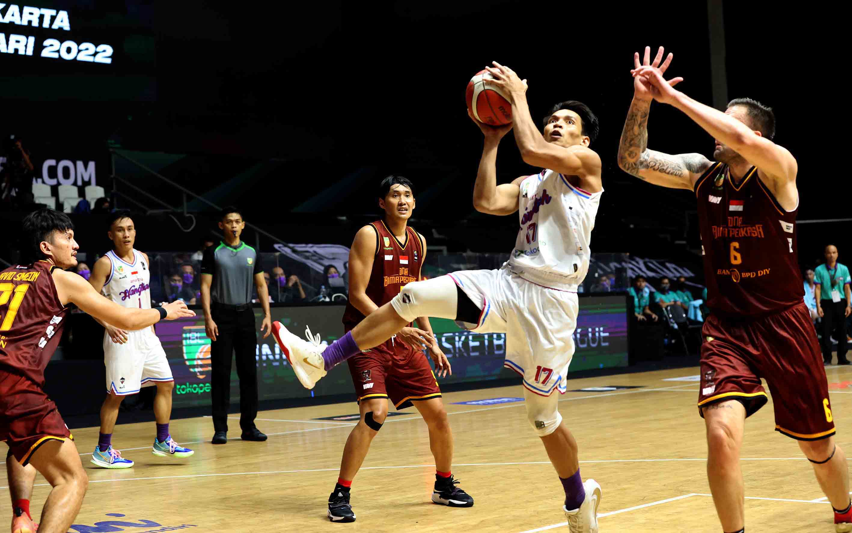 Fisyaiful Amir (17) pemain Amartha Hangtuah Jakarta bersiap melempar bola ke arah ring DNA Bima Perkasa Jogja. Amartha Hangtuah Jakarta melawan DNA Bima Perkasa Jogja pada pertandingan Seri 1 Jakarta Indonesian Basketball League (IBL) 2022 di Hall Basket GBK, Jakarta, Selasa (18/1/2022). Amartha Hangtuah Jakarta menang atas DNA Bima Perkasa Jogja dengan skor 68-53. (Photo : Bobby Arifin),