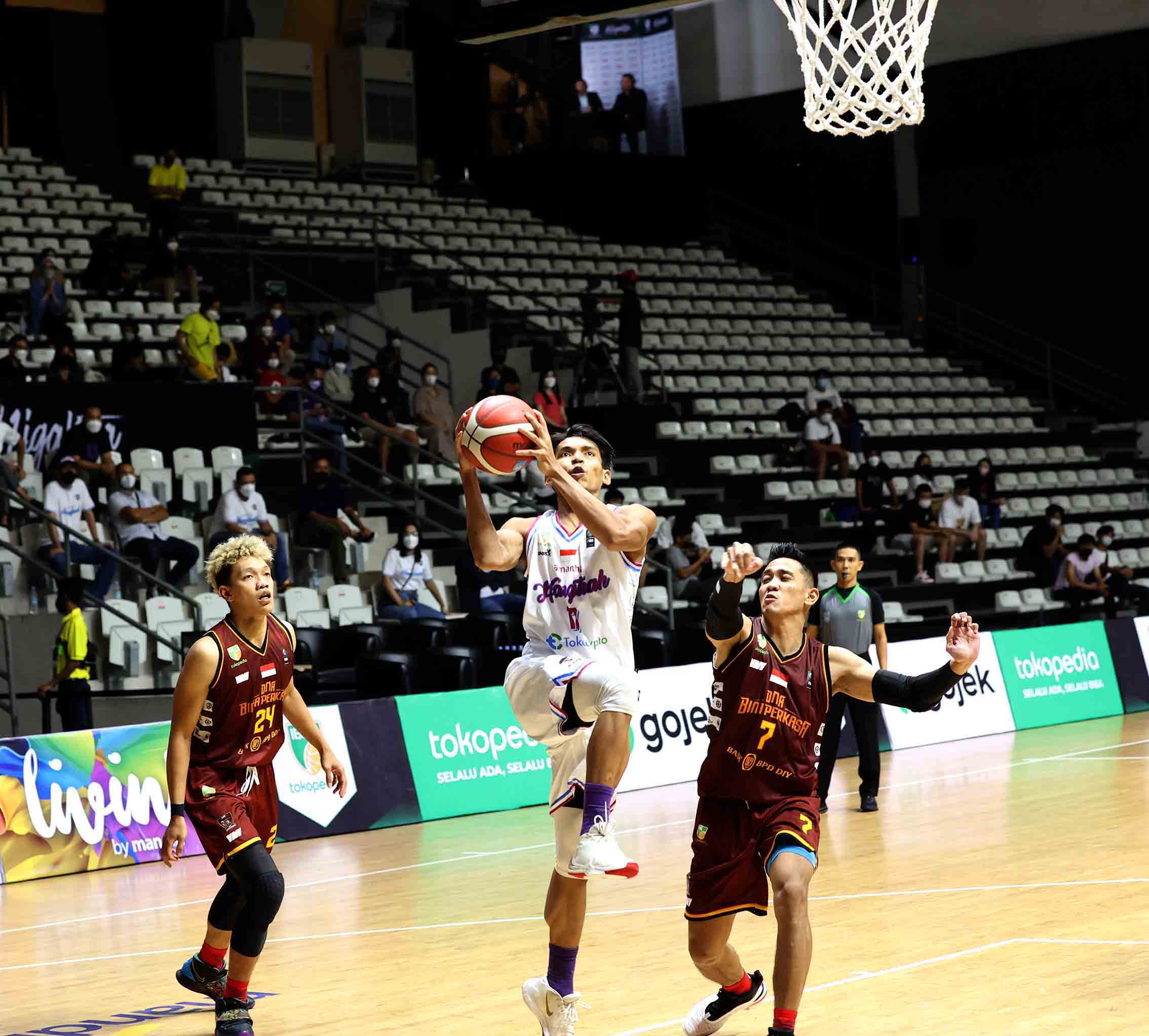 Fisyaiful Amir (17) pemain Amartha Hangtuah Jakarta bersiap melempar bola ke arah ring DNA Bima Perkasa Jogja. Amartha Hangtuah Jakarta melawan DNA Bima Perkasa Jogja pada pertandingan Seri 1 Jakarta Indonesian Basketball League (IBL) 2022 di Hall Basket GBK, Jakarta, Selasa (18/1/2022). Amartha Hangtuah Jakarta menang atas DNA Bima Perkasa Jogja dengan skor 68-53. (Photo : Bobby Arifin),