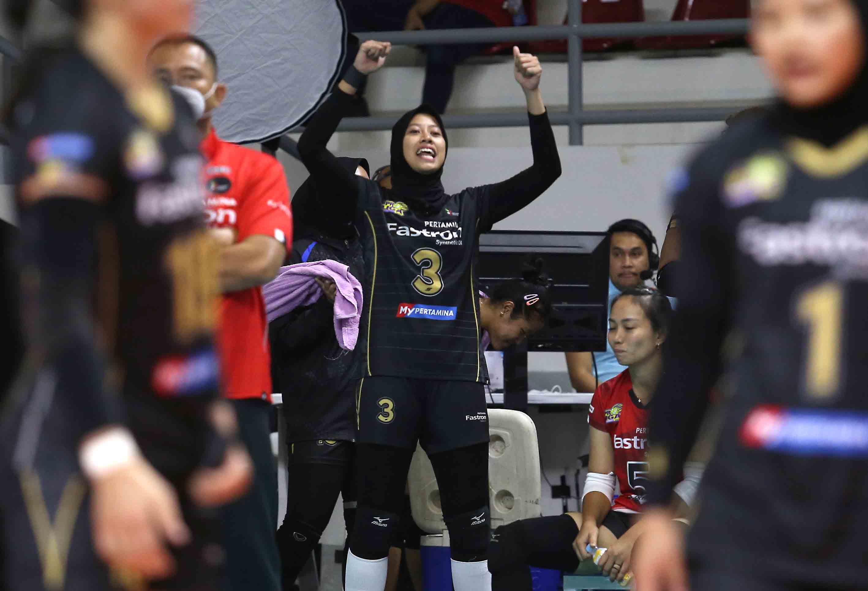 Jakarta Pertamina Fastron berhasil menang atas Jakarta Mandiri Popsivo Polwan dengan skor 3-0 (25-21, 25-22, 25-21). Pertandingan Proliga 2022 putaran kedua minggu ke 7 yang berlangsung di GOR Padepokan Voli Jenderal Polisi Kunarto, Sentul, Minggu (16/1/2022). (Foto : Erly Bahtiar/Sportsmoment.id)