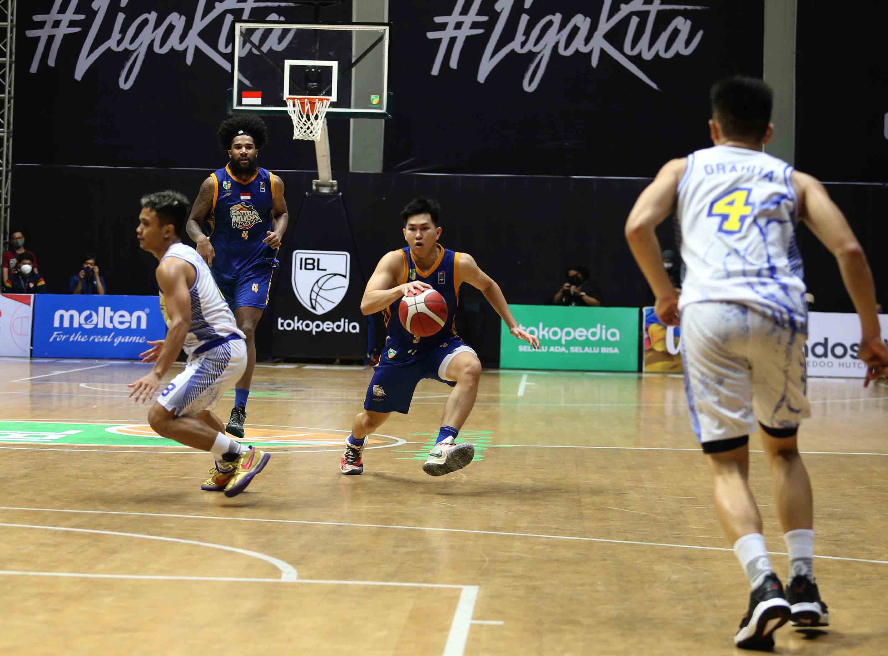 Antoni Erga (3) pemain Satria Muda Pertamina Jakarta melakukan serangan ke arah pertahanan Prawira Bandung. Satria Muda Pertamina Jakarta melawan Prawira Bandung pada pertandingan Seri 1 Jakarta Indonesian Basketball League (IBL) 2022 di Hall Basket GBK, Jakarta, Jum’at (21/1/2022). Satria Muda Pertamina Jakarta menang atas Prawira Bandung dengan skor 68-66. (Photo : Erly Bahtiar),
