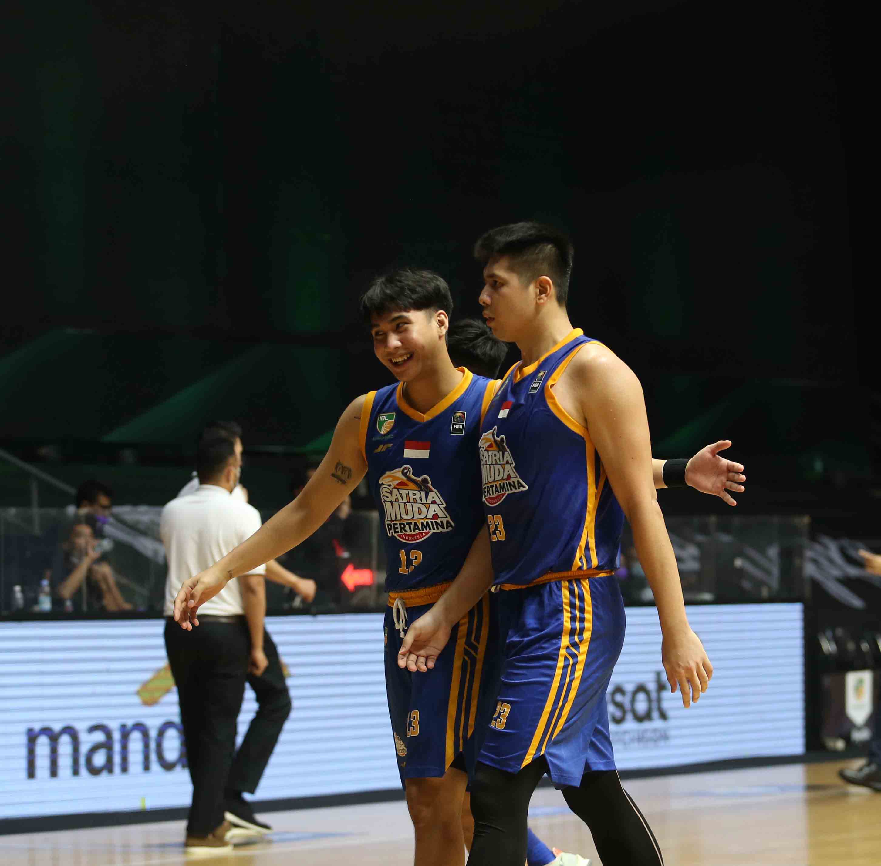 Selebrasi para pemain Satria Muda Pertamina Jakarta saat melawan Prawira Bandung pada pertandingan Seri 1 Jakarta Indonesian Basketball League (IBL) 2022 di Hall Basket GBK, Jakarta, Jum’at (21/1/2022). Satria Muda Pertamina Jakarta menang atas Prawira Bandung dengan skor 68-66. (Photo : Erly Bahtiar)