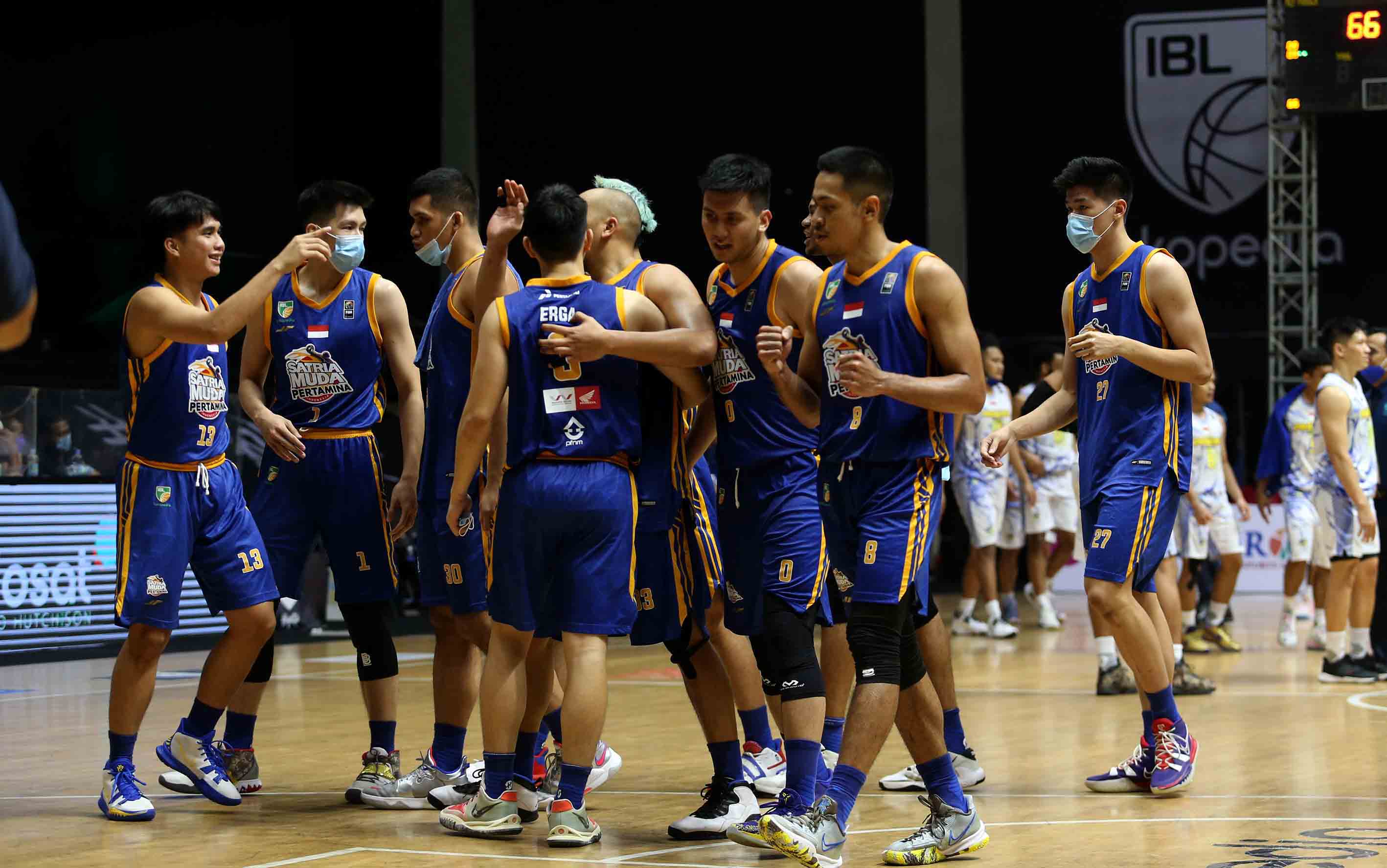Selebrasi para pemain Satria Muda Pertamina Jakarta saat melawan Prawira Bandung pada pertandingan Seri 1 Jakarta Indonesian Basketball League (IBL) 2022 di Hall Basket GBK, Jakarta, Jum’at (21/1/2022). Satria Muda Pertamina Jakarta menang atas Prawira Bandung dengan skor 68-66. (Photo : Erly Bahtiar)