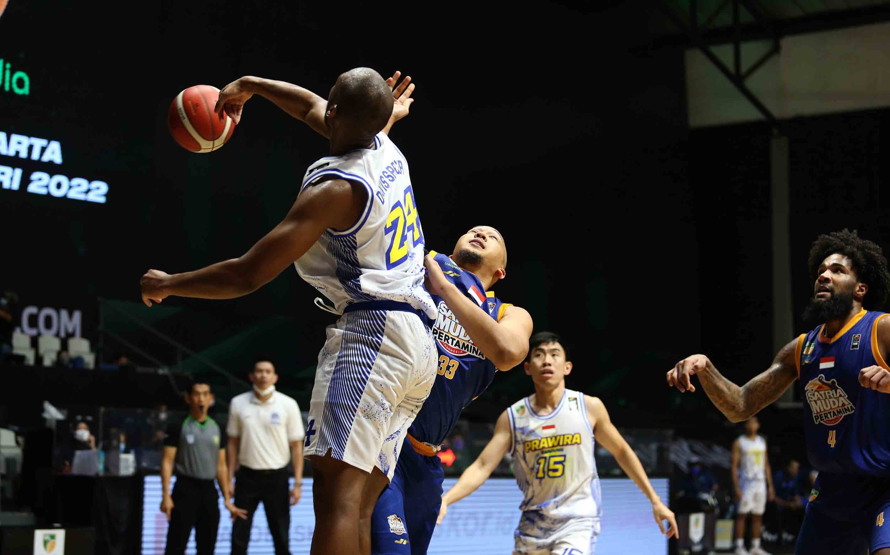 Taj Davis Spencer (24) pemain Prawira Bandung mengamankan bola dari pemain Satria Muda Pertamina Jakarta, Arki Dikania Wisnu (33). Prawira Bandung melawan Satria Muda Pertamina Jakarta pada pertandingan Seri 1 Jakarta Indonesian Basketball League (IBL) 2022 di Hall Basket GBK, Jakarta, Jum’at (21/1/2022). Prawira Bandung kalah oleh Satria Muda Pertamina Jakarta dengan skor 66-68. (Photo : Erly Bahtiar).